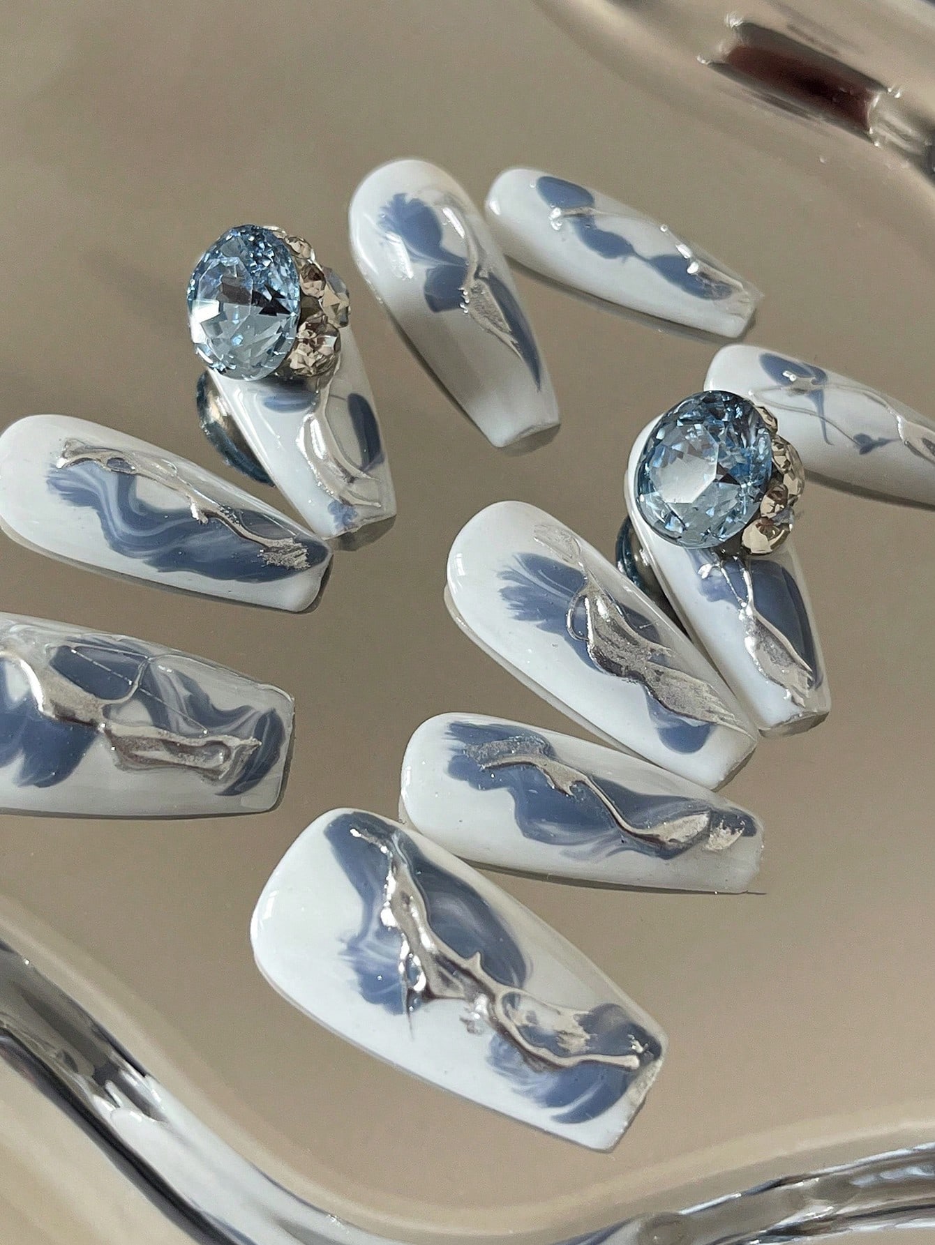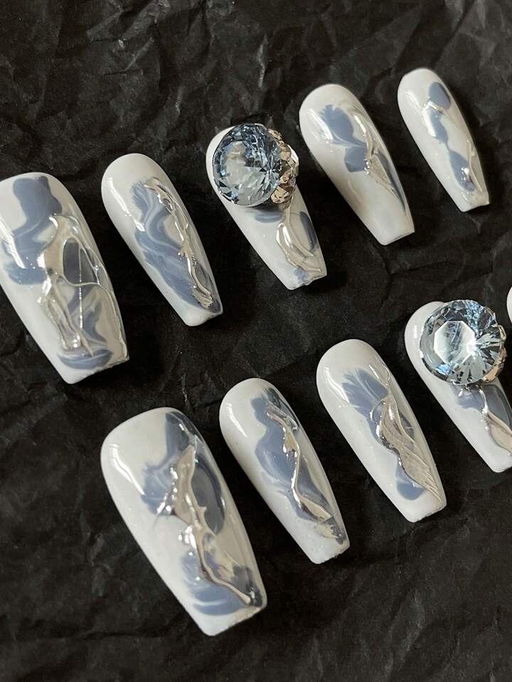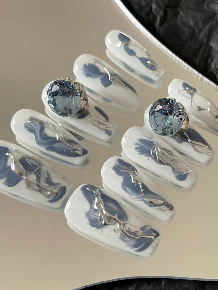 10pcs Long Coffin 3D Rhinestone Decor Fake Nail Kit