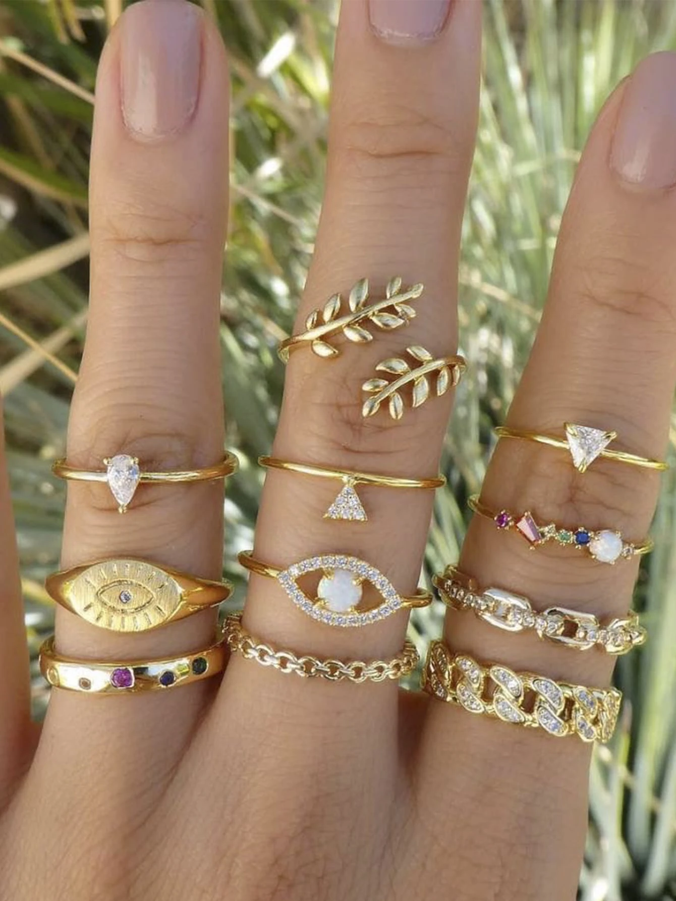 11pcs Rhinestone Chain & Leaf Ring