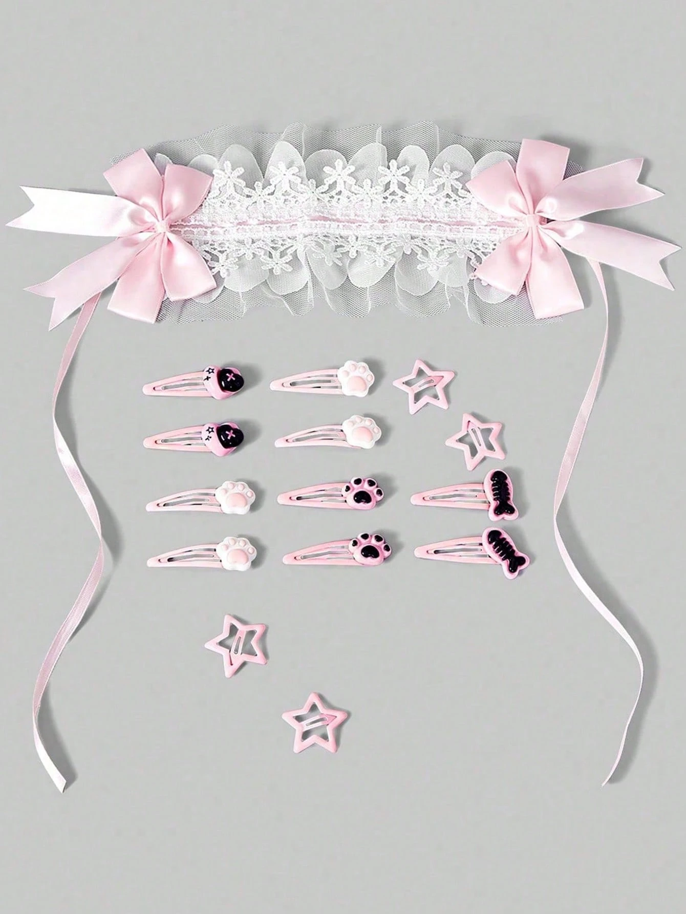 15 Random Styles Cute Pink Lace Hairpin, Lolita Cat Paw Love Fishbone Star Bow Element Hair Clips