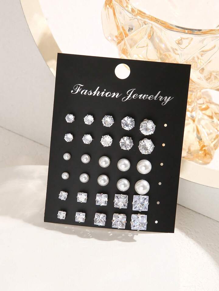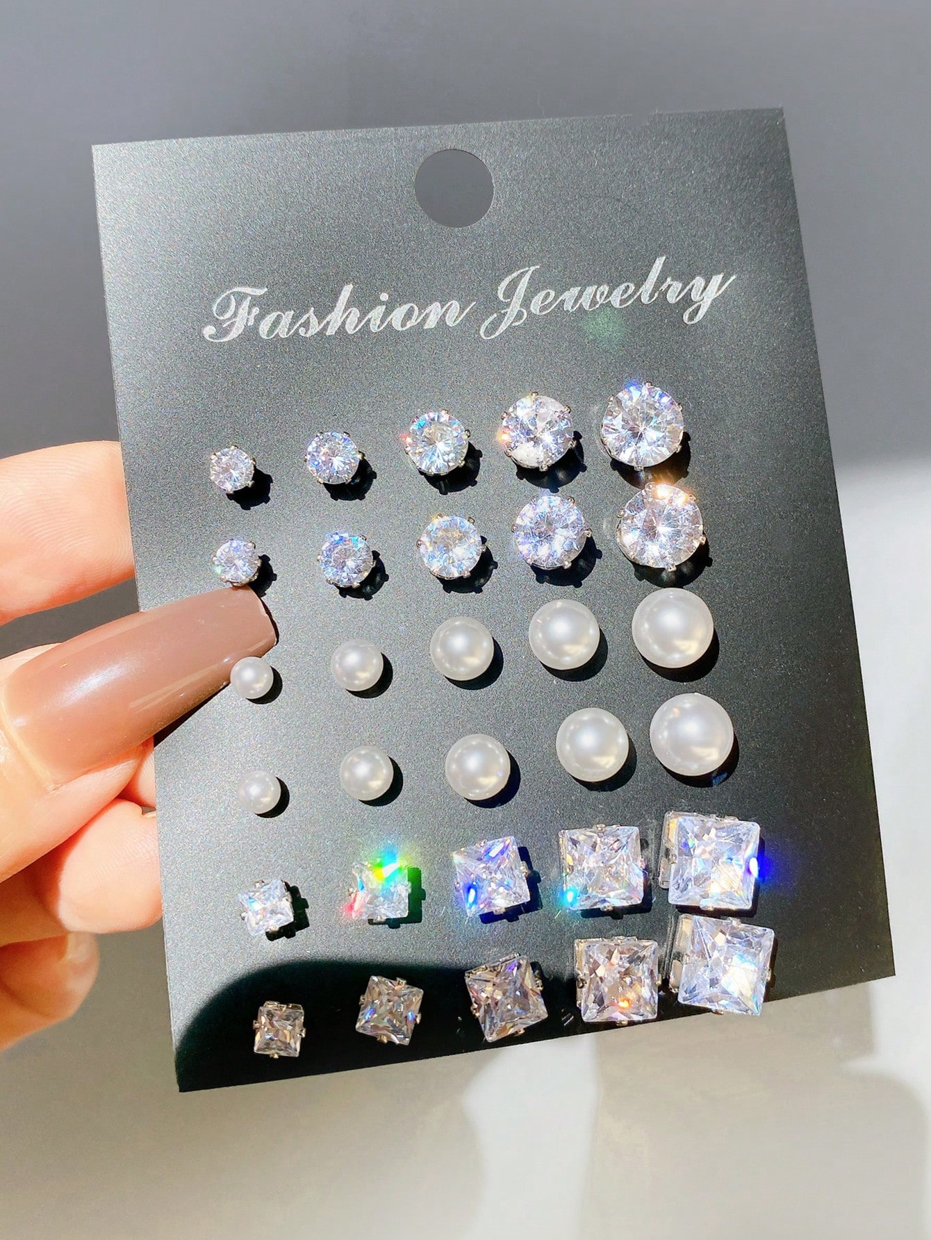 15pairs Glamorous Rhinestone & Faux Pearl Decor Stud Earrings For Women For Daily Decoration