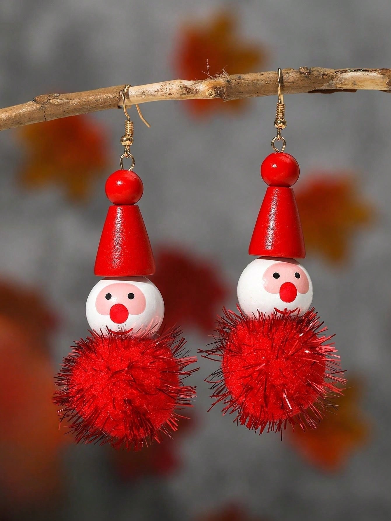 1pair Creative Christmas Snowman Wood Bead, Golden Wire & Pom Pom Ball Earrings