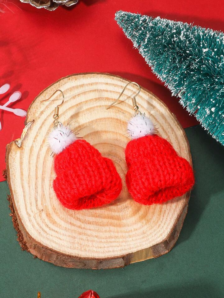 1pair Cute Christmas Handmade Knitted Pom-pom Hat Shaped Earrings