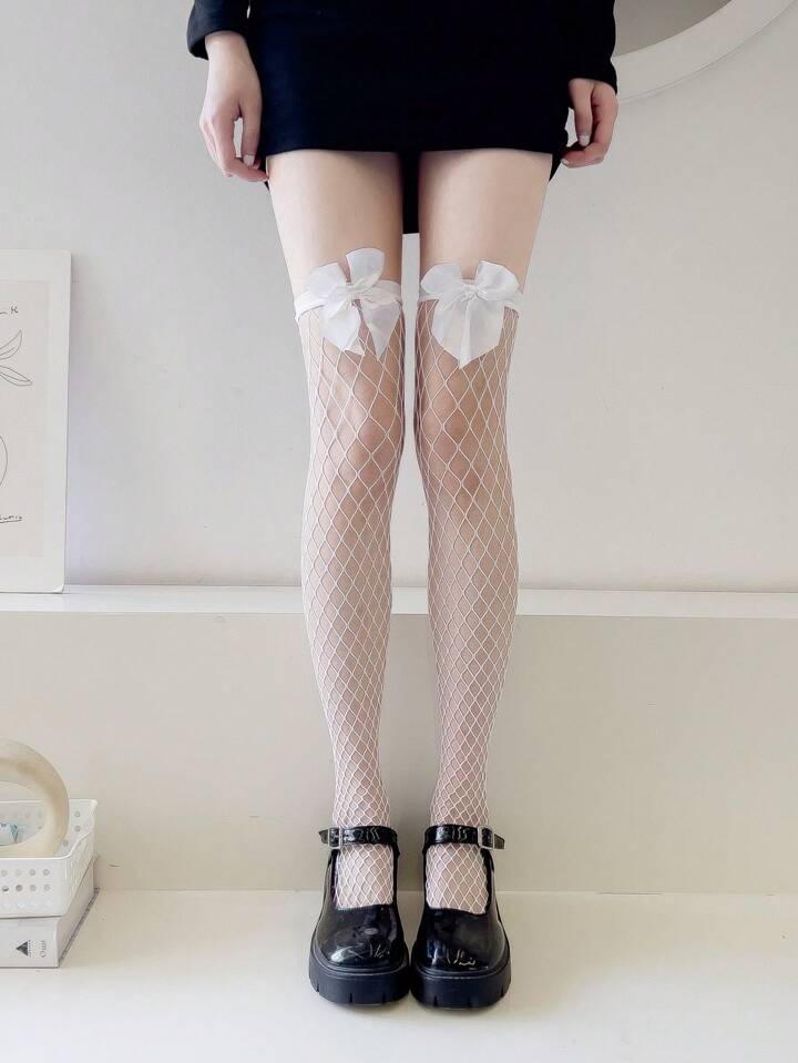 1pair Women Bow Decor Fishnet Over The Knee Socks