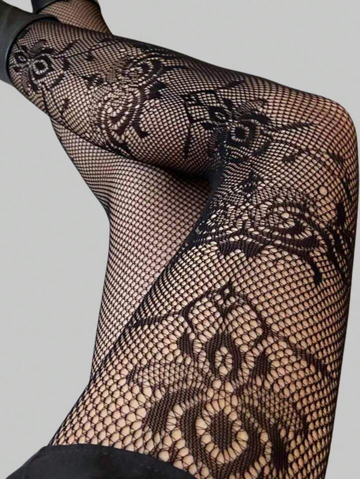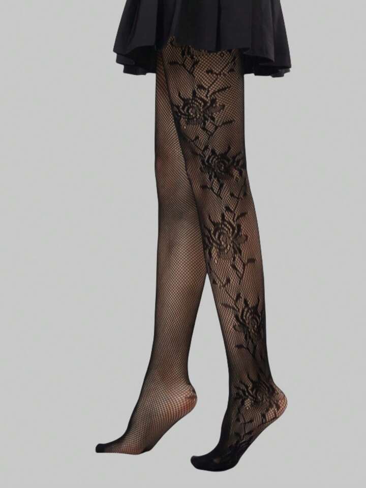 1pair Women's Black Gothic Jacquard Fishnet Stockings For All Seasons, Halloween