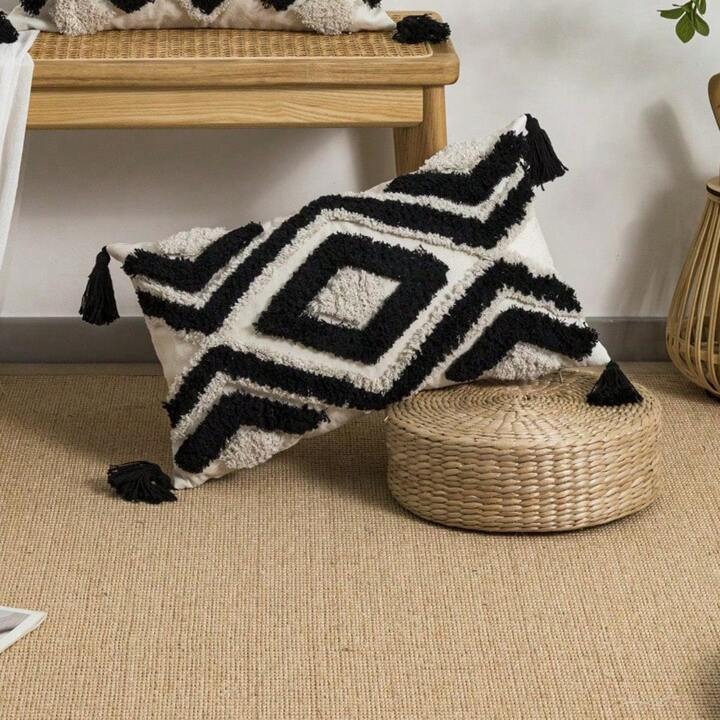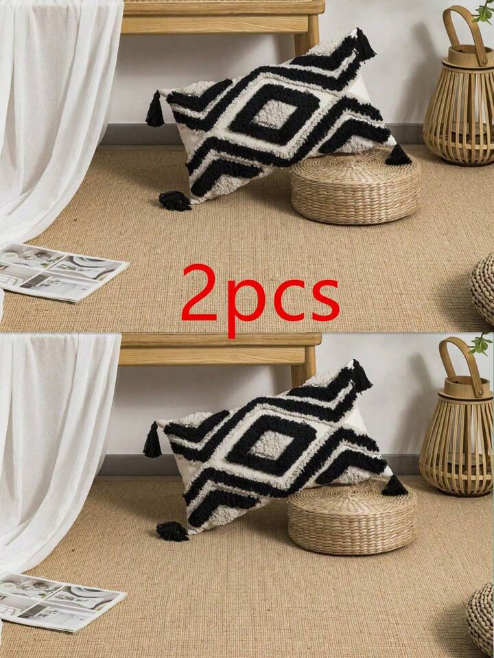 1pc/2pcs Set Rhombus Pattern Throw Pillow Cover, Nordic Ins Style Moroccan Tufted Embroidery, 4-Tassels Cushion Cover For Home Decor, Car Waist Pillow, Living Room Sofa, 30*50cm, 45*45cm (Without Insert)