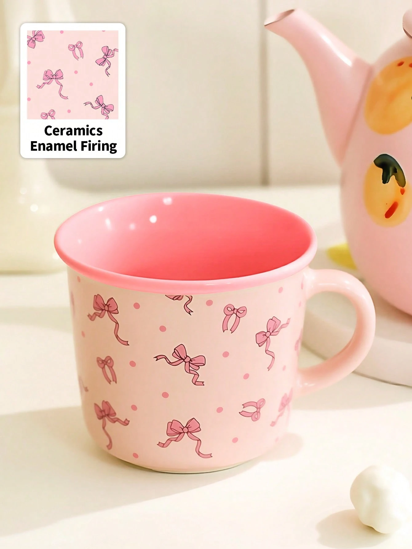 1pc Colored Ceramic Coffee Cup, Pink Simple Household Water Cup, Dishwasher, Microwave Compatible,Bow Pattern Cup, Kawaii Style,Suitable For Restaurant Or Home,Home Decor