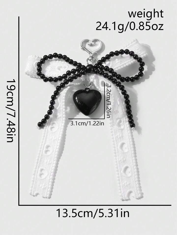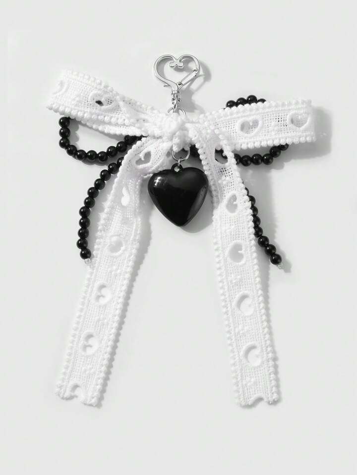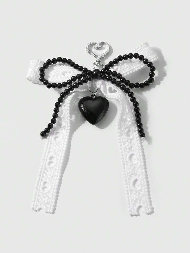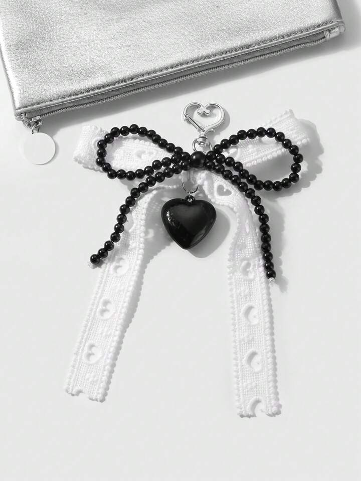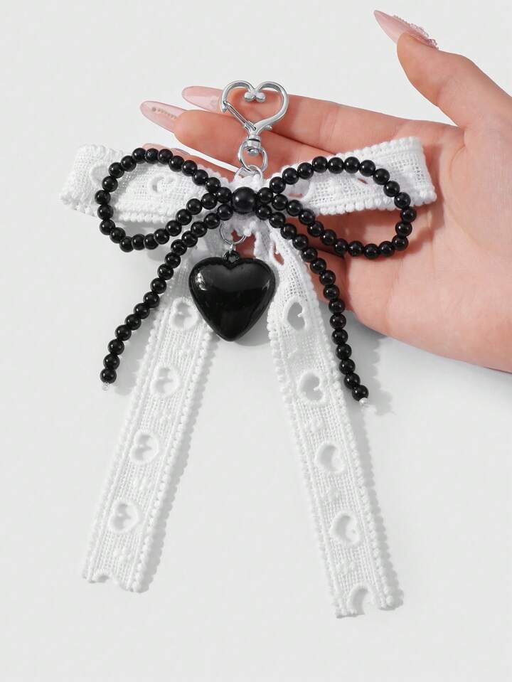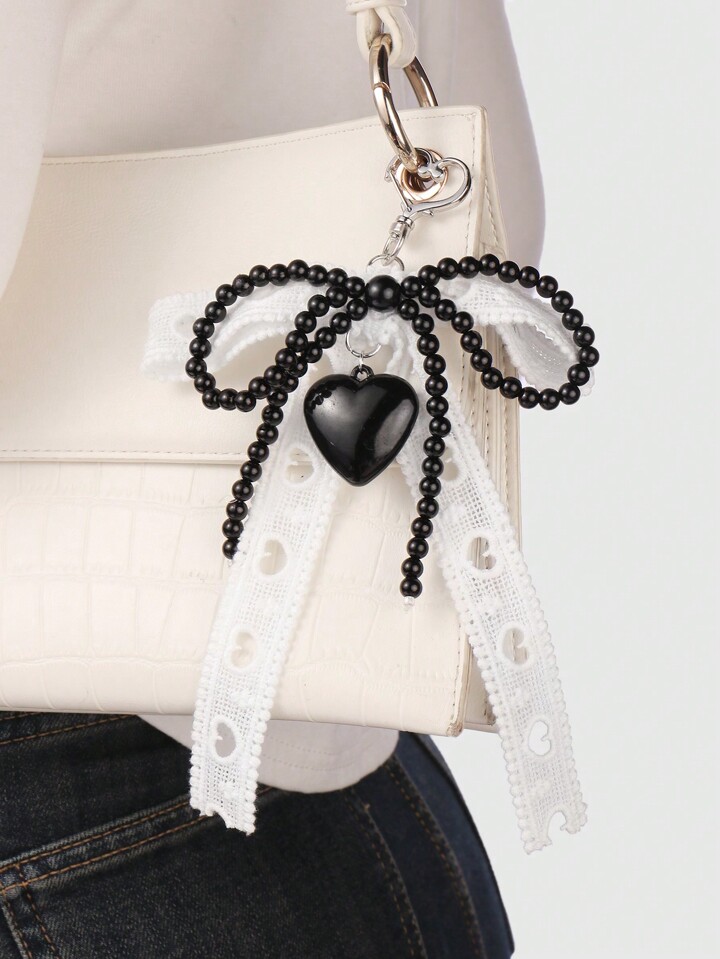 1pc Elegant Minimalist Gothic Style Handmade Beaded Black Bead, White Hollow Heart Ribbon Bow Acrylic Heart Pendant Key Chain Bag Charm, Versatile Accessory, Suitable For Women, Gift