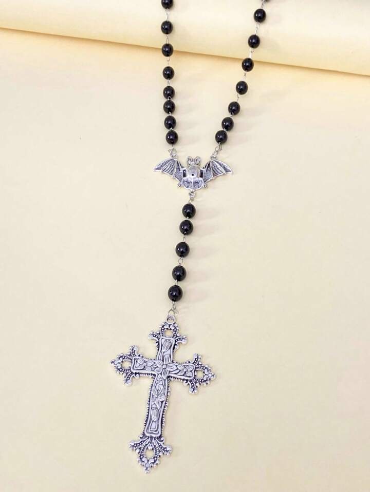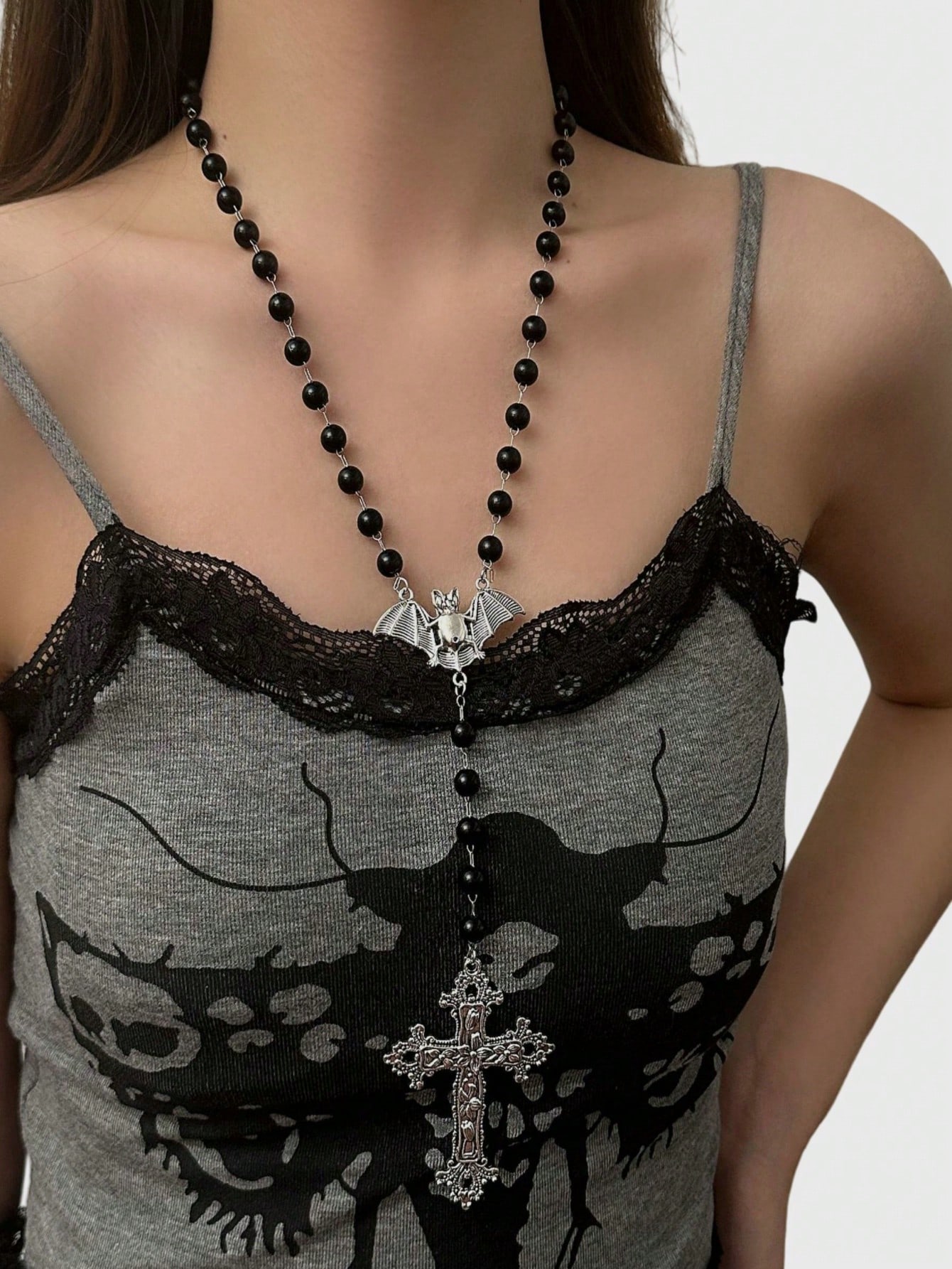 1pc Fashion Gothic Cross & Bat Beaded Pendant Necklace For Punk Style
