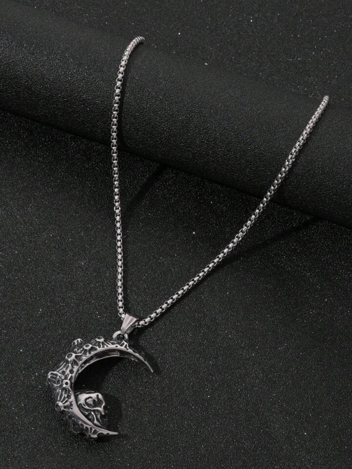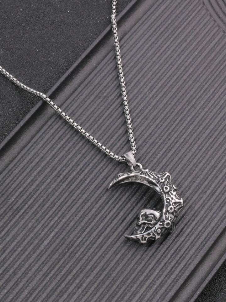 1pc Funky Stainless Steel Moon & Skull Pendant Necklace For Men For Daily Decoration