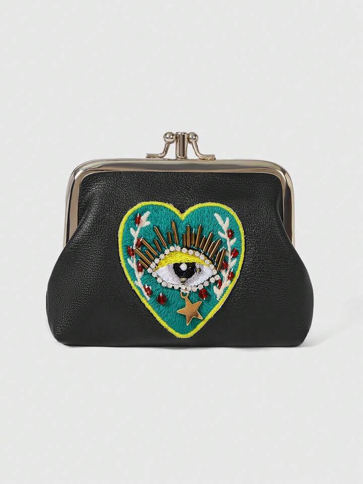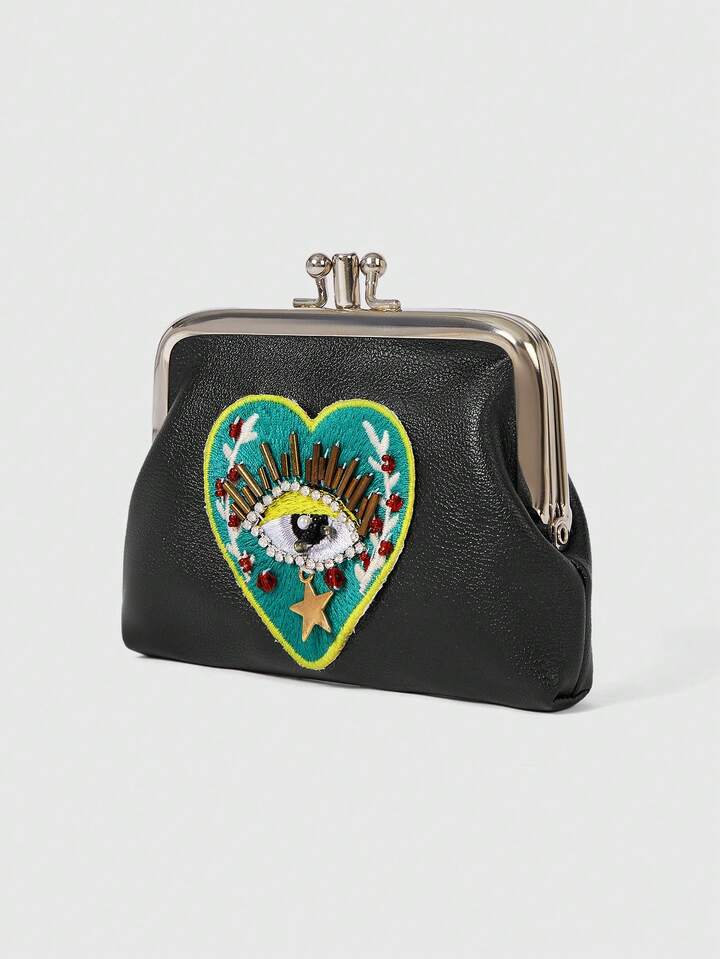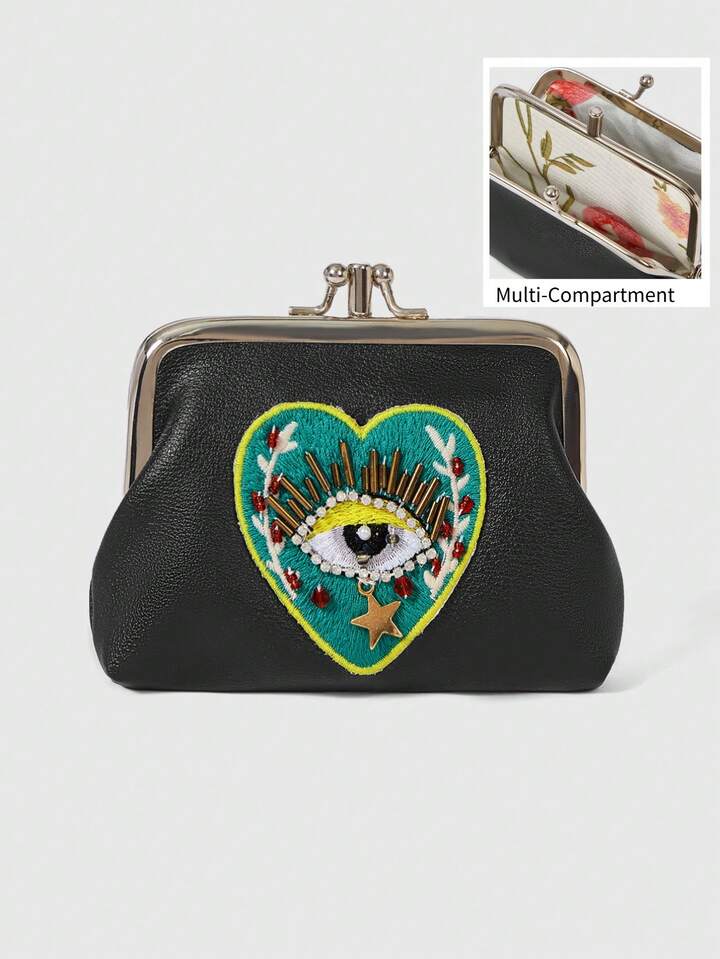 1pc Gothic Style Blue Eye & Red Heart Beaded Pu Leather Short Wallet For Women