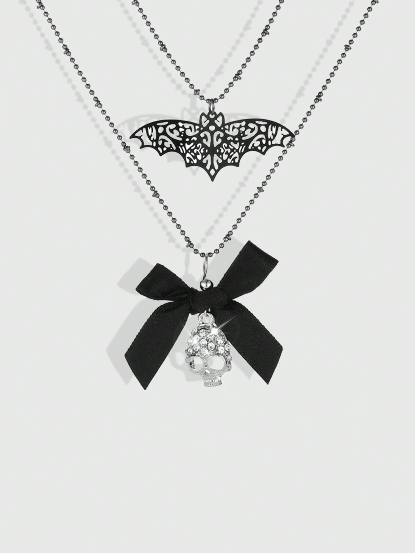 1pc Gothic Style Bowknot Pendant, Bat & Skull Design Necklace, Halloween