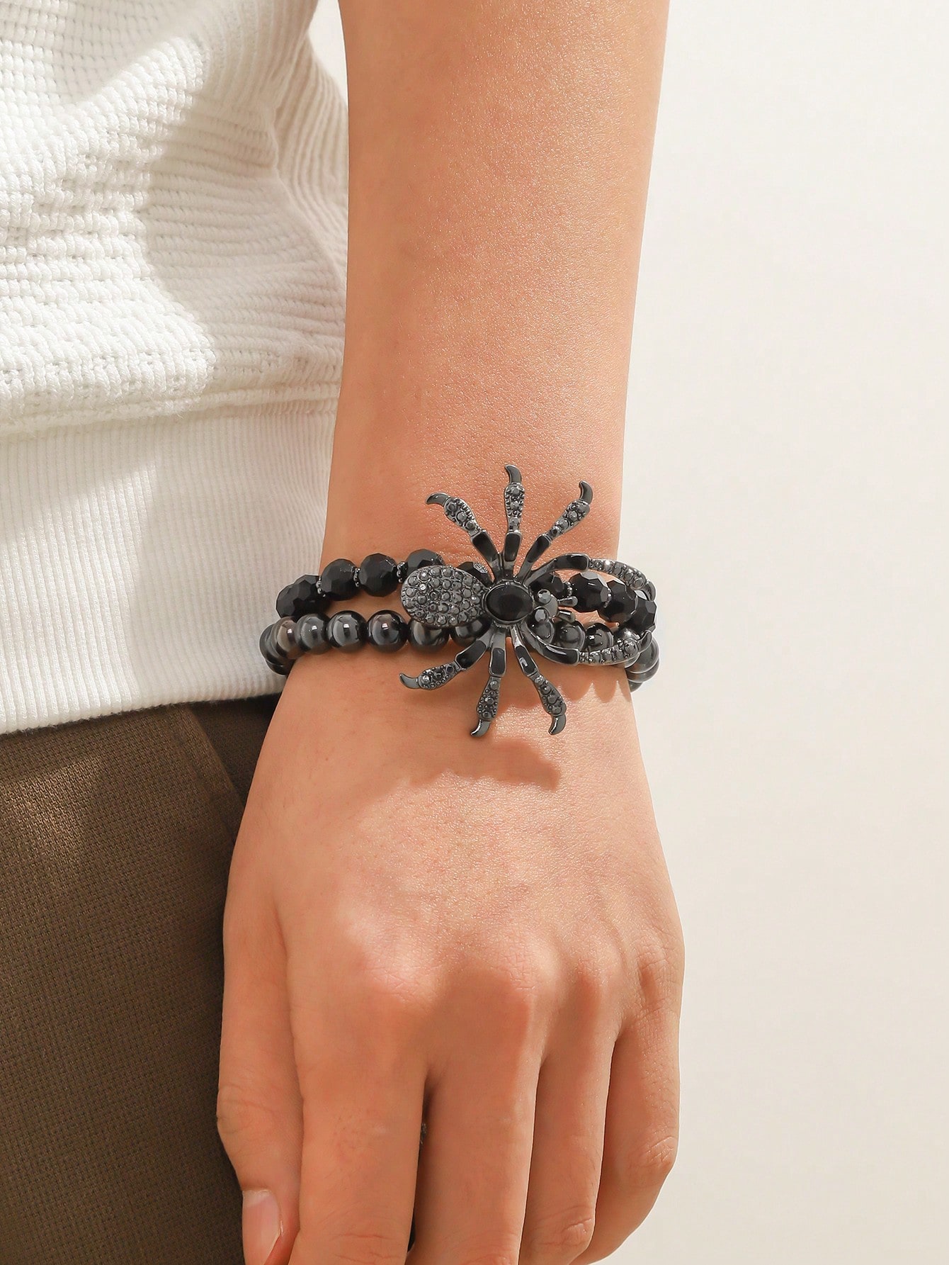 1pc Gothic Style Exaggerated Black Spider Geometric Glitter Double-layered Beaded Men's Bracelet With Rhinestones