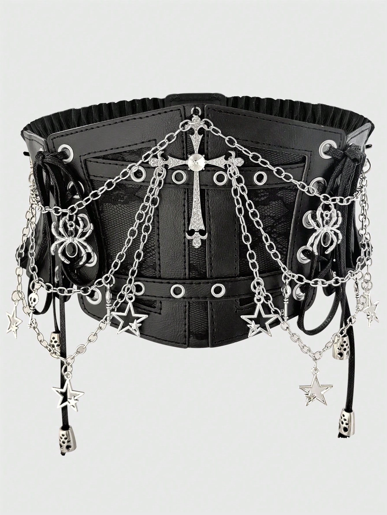 1pc Women Black Lace Chain Skeleton Cross Ribbon Decor Goth Style Elastic Waist Belt, Gothic Halloween Costume Accessory