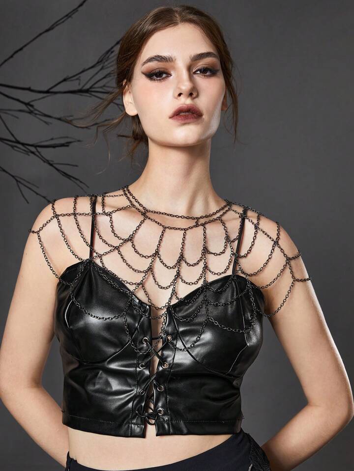 1pc Women's Black Spider Web Shaped Decor Gothic Body Chain, Halloween Accessory