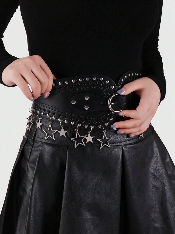 1pc Y2K Punk Retro Gothic Star Cut-Out Rivet Decor Black Waist Belt&Pants Buckle Set, Fashionable & Stylish, Women Daily Wear, Gifts