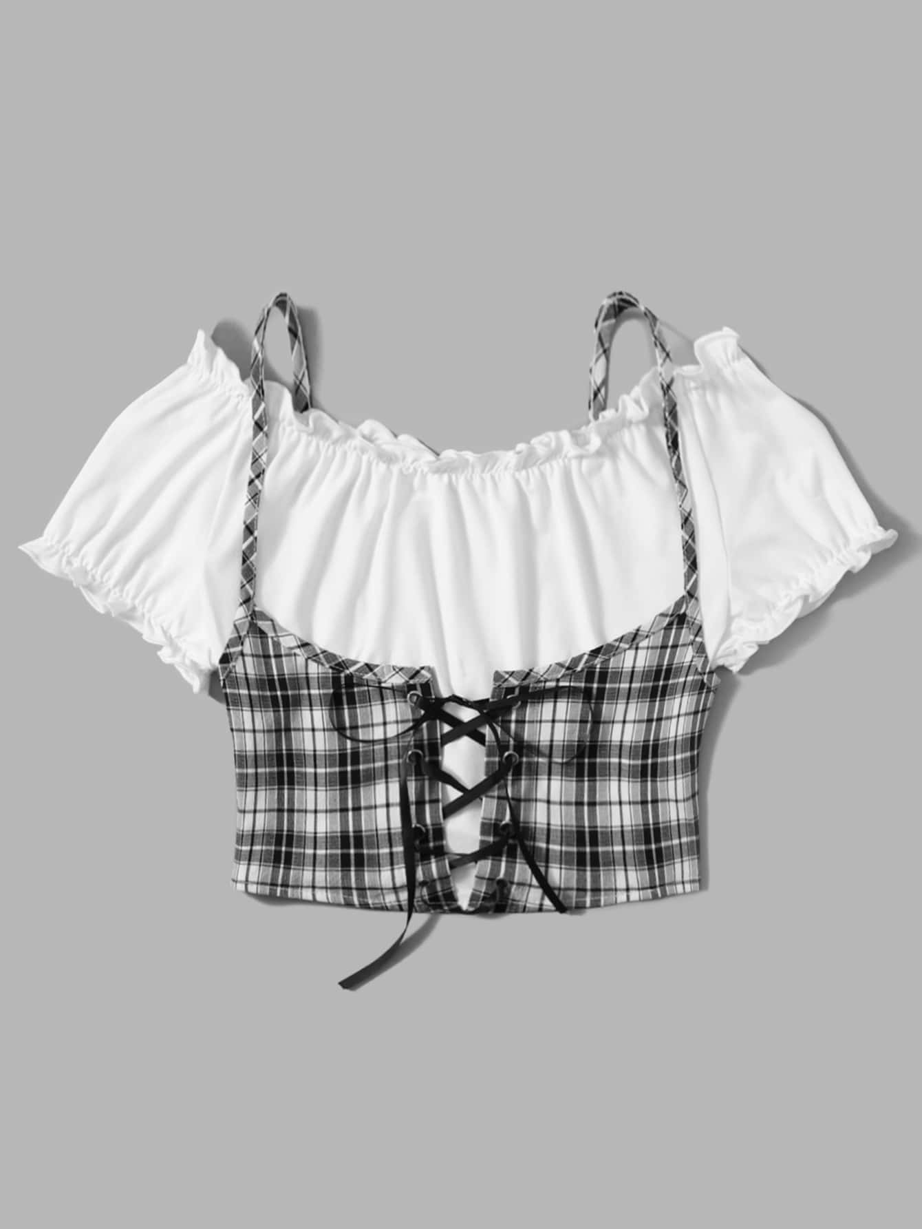 2 In 1 Plaid Lace Up Frill Crop Blouse
