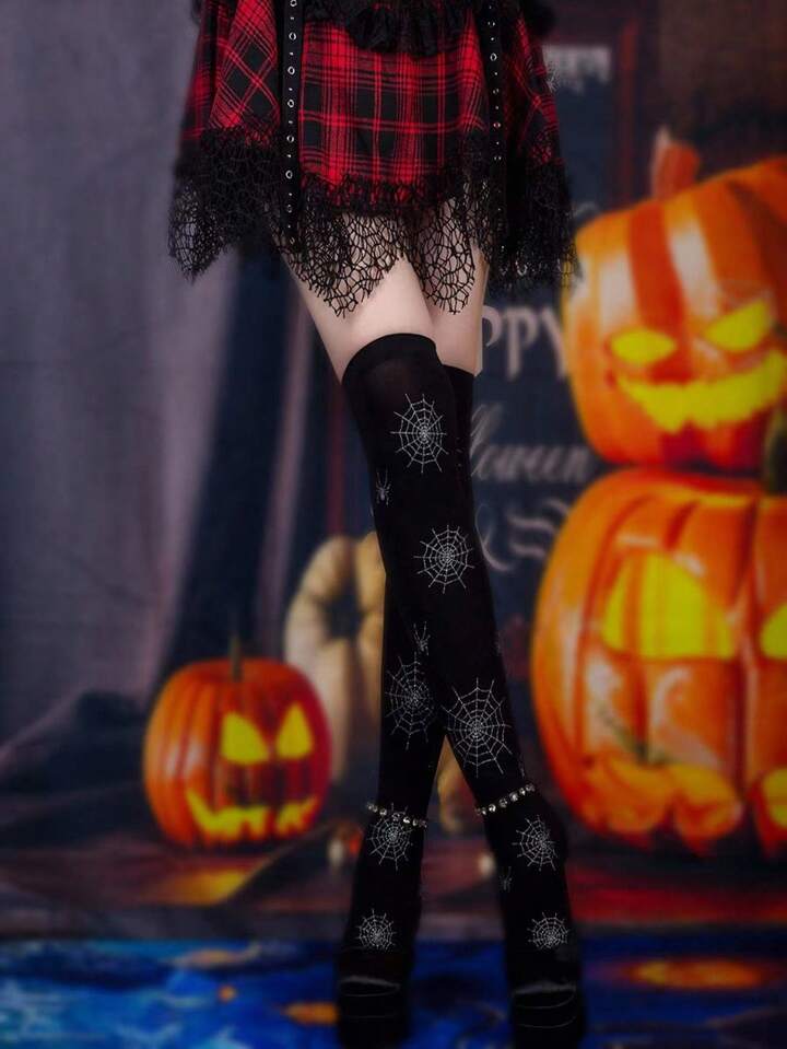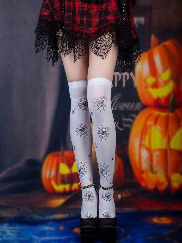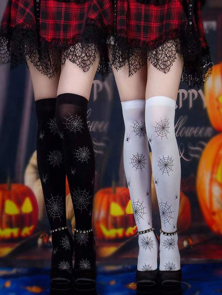 2 Pairs Spider Web Patterned Sexy Thigh High Stockings, For Women, Halloween