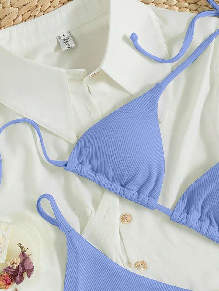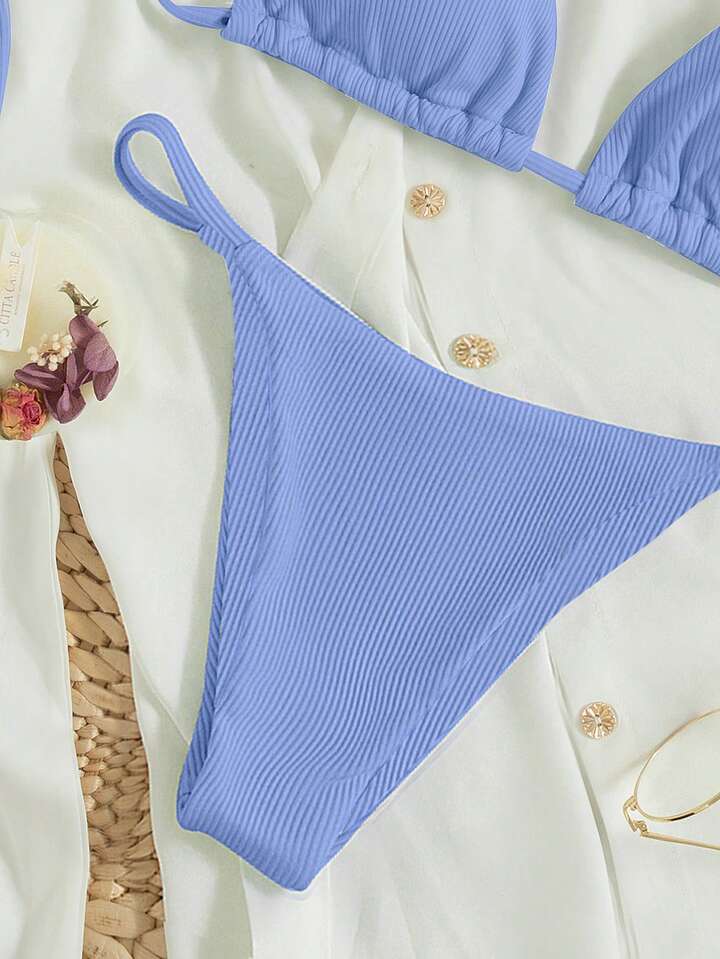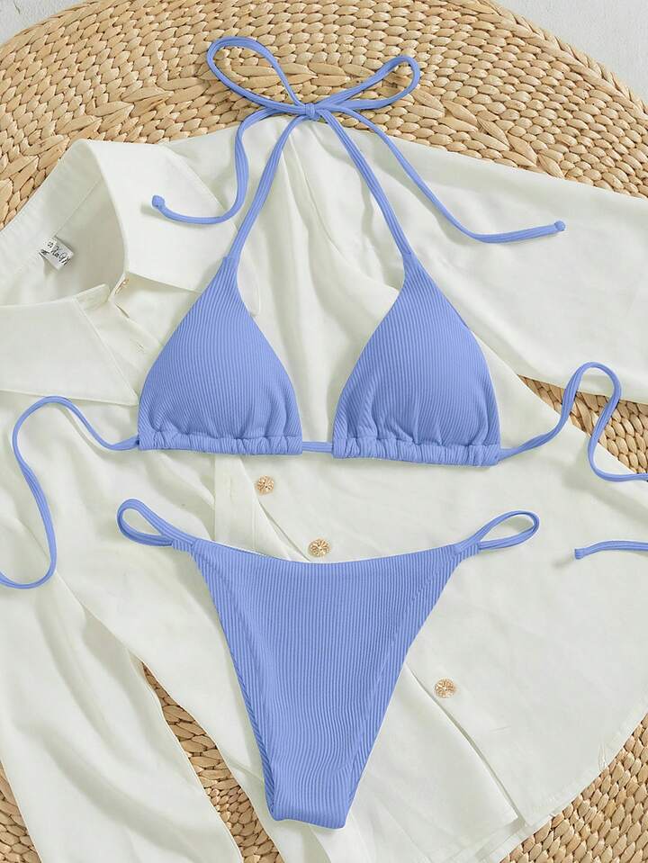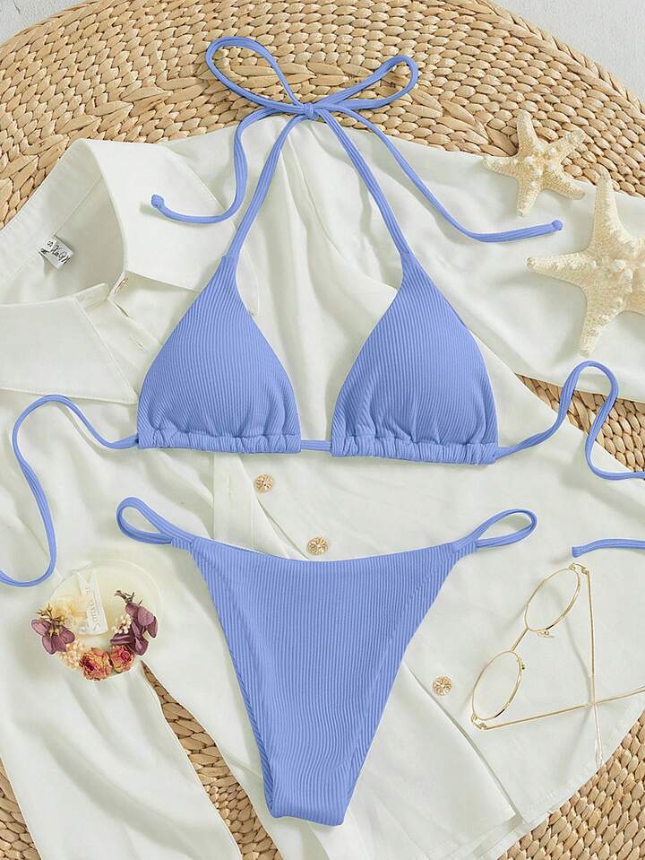 2026 Spring/Summer Women's Vacation Special Fabric Spaghetti Strap Halter Blue Sexy Thong Bikini 2-Piece Swimsuit