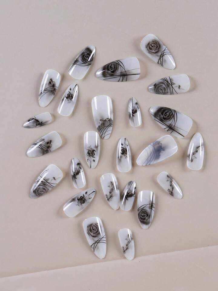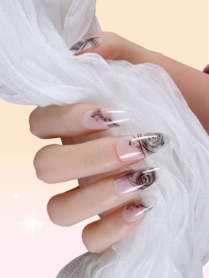 24pcs Almond Flower Print Fake Nail & 1sheet Tape