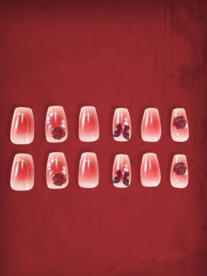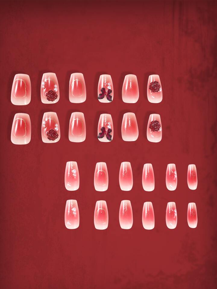 24pcs Coffin 3D Flower Decor Fake Nail & 1sheet Tape