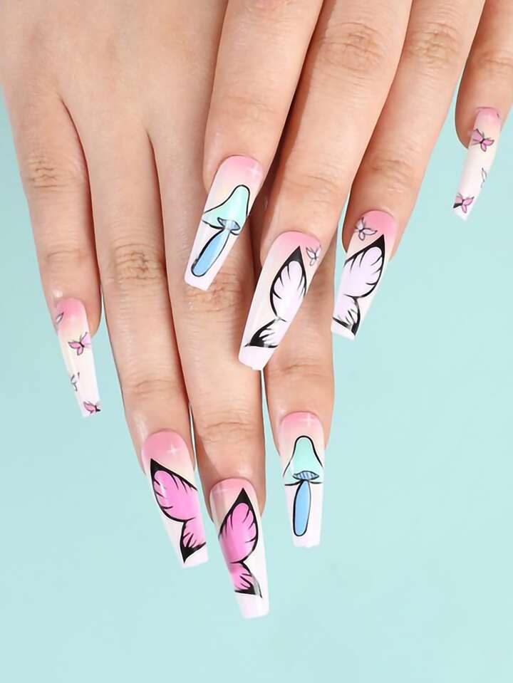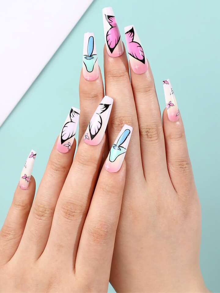 24pcs Coffin Butterfly Print Fake Nail & 1sheet Tape