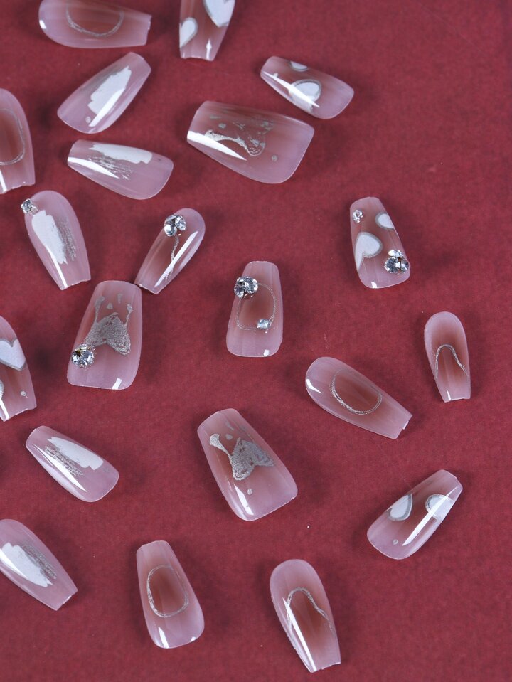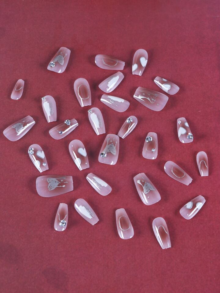 24pcs Coffin Heart Print Fake Nail & 1sheet Tape