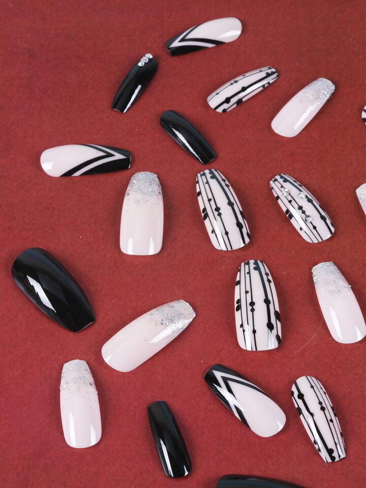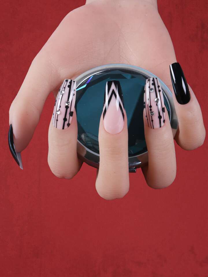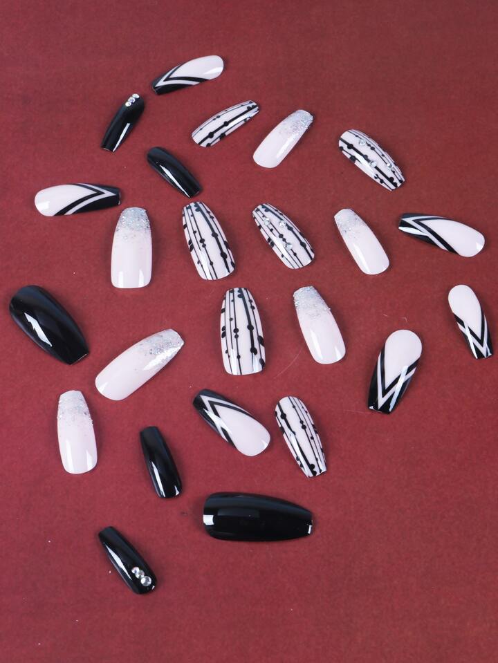 24pcs Long Coffin 3D Rhinestone Decor Fake Nail & 1sheet Tape