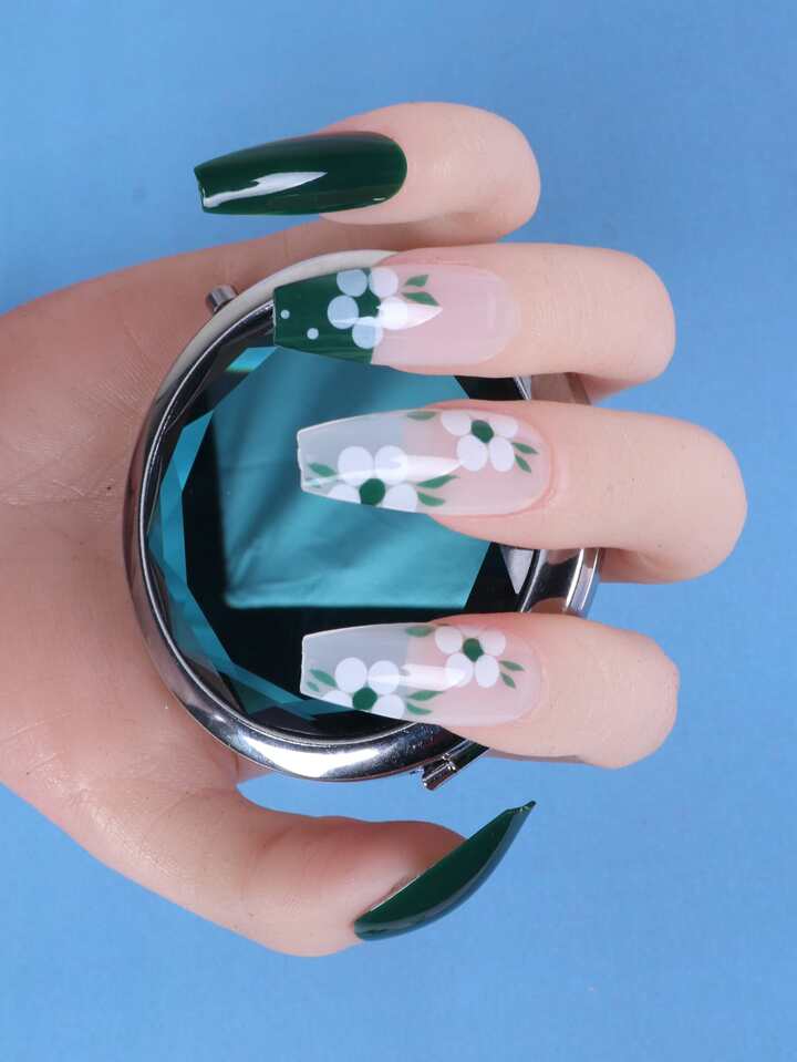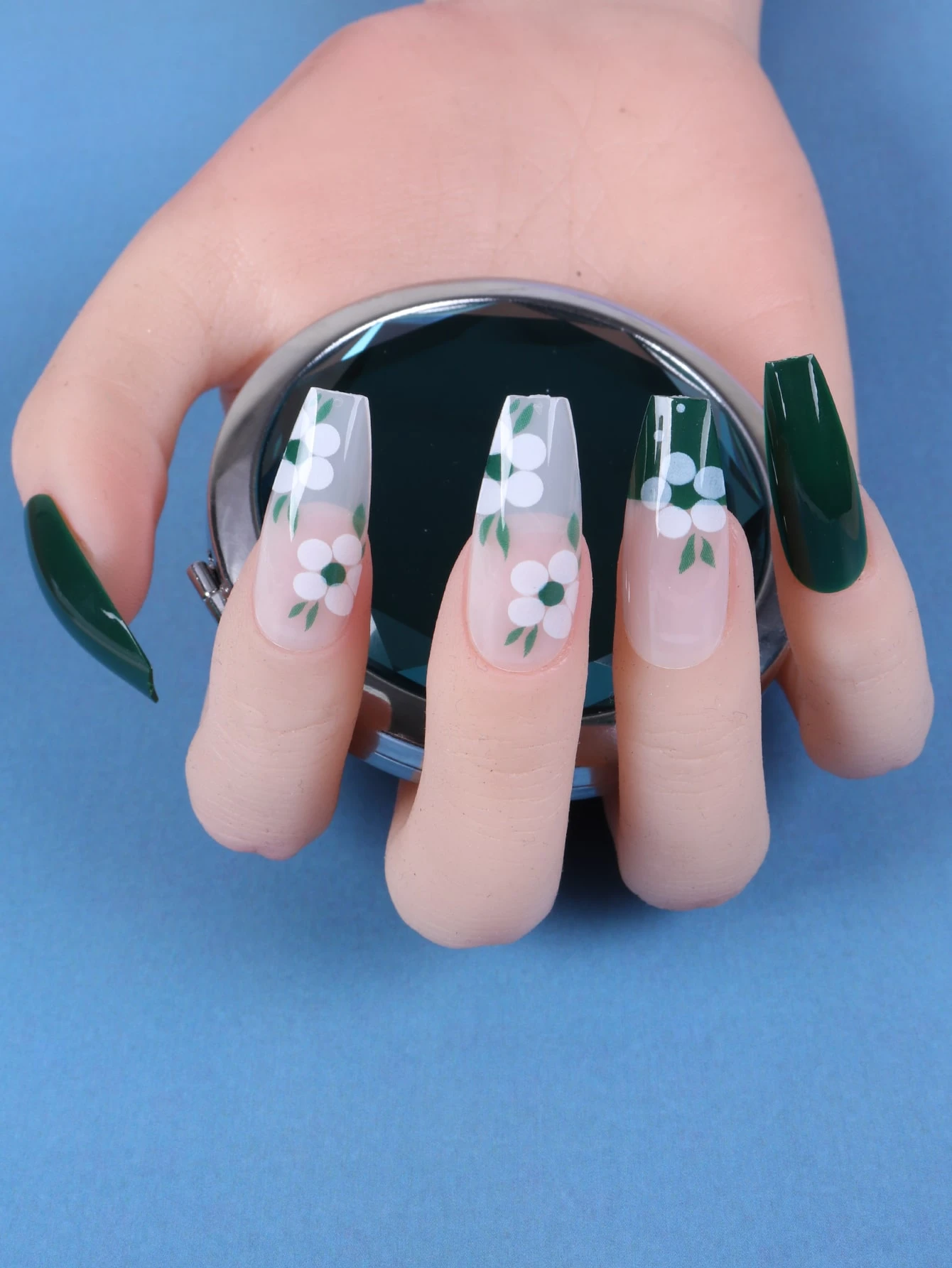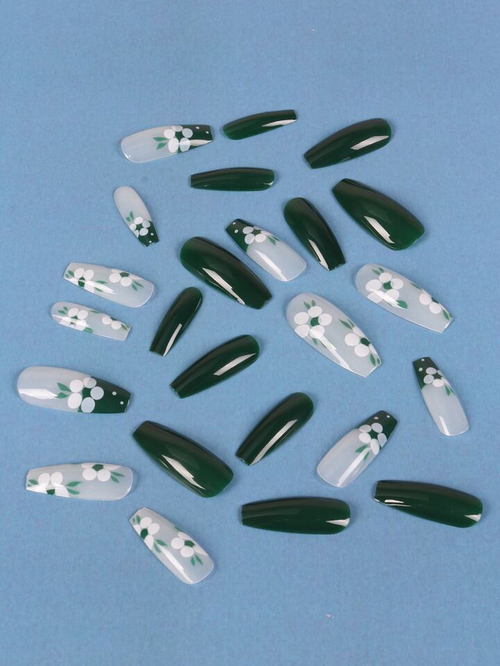 24pcs Long Coffin Floral Pattern Fake Nail & 1sheet Tape
