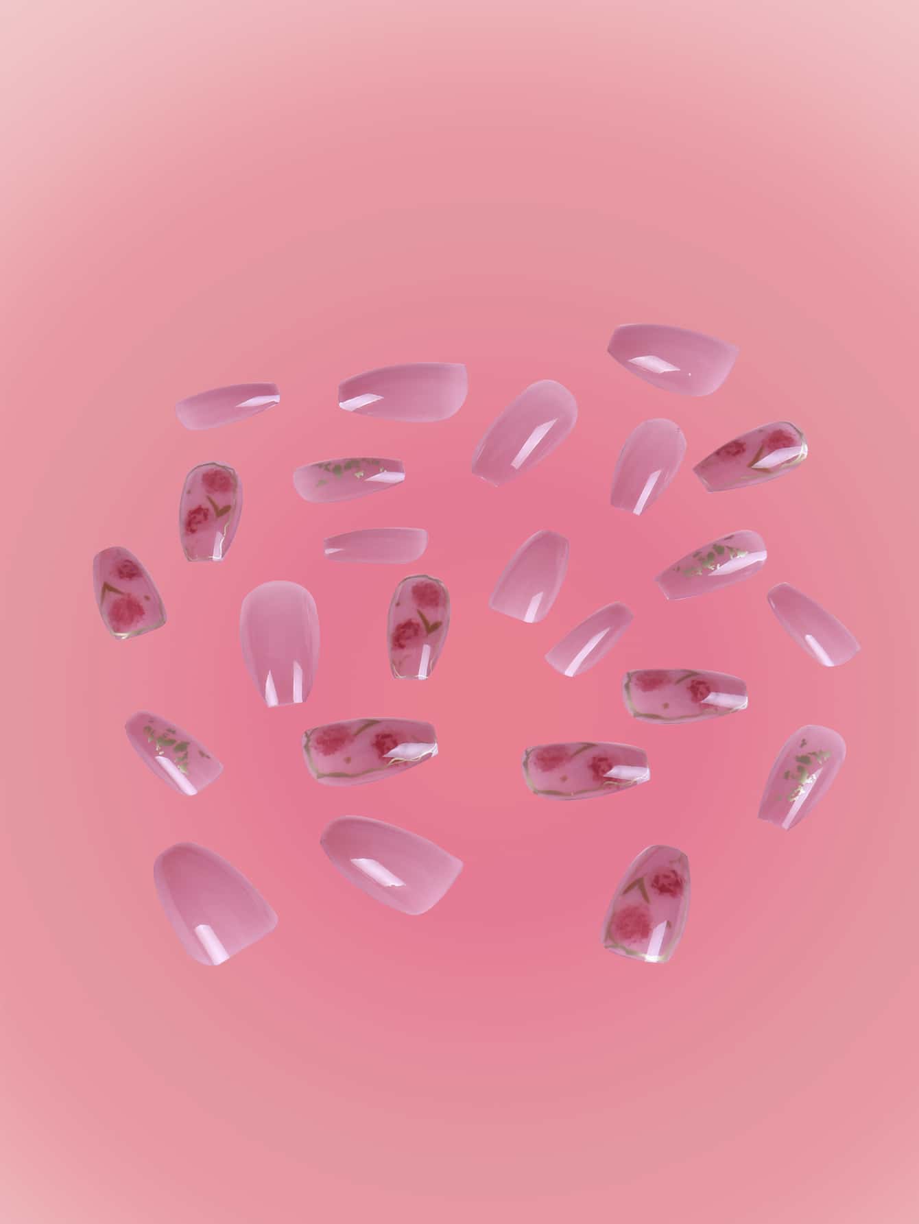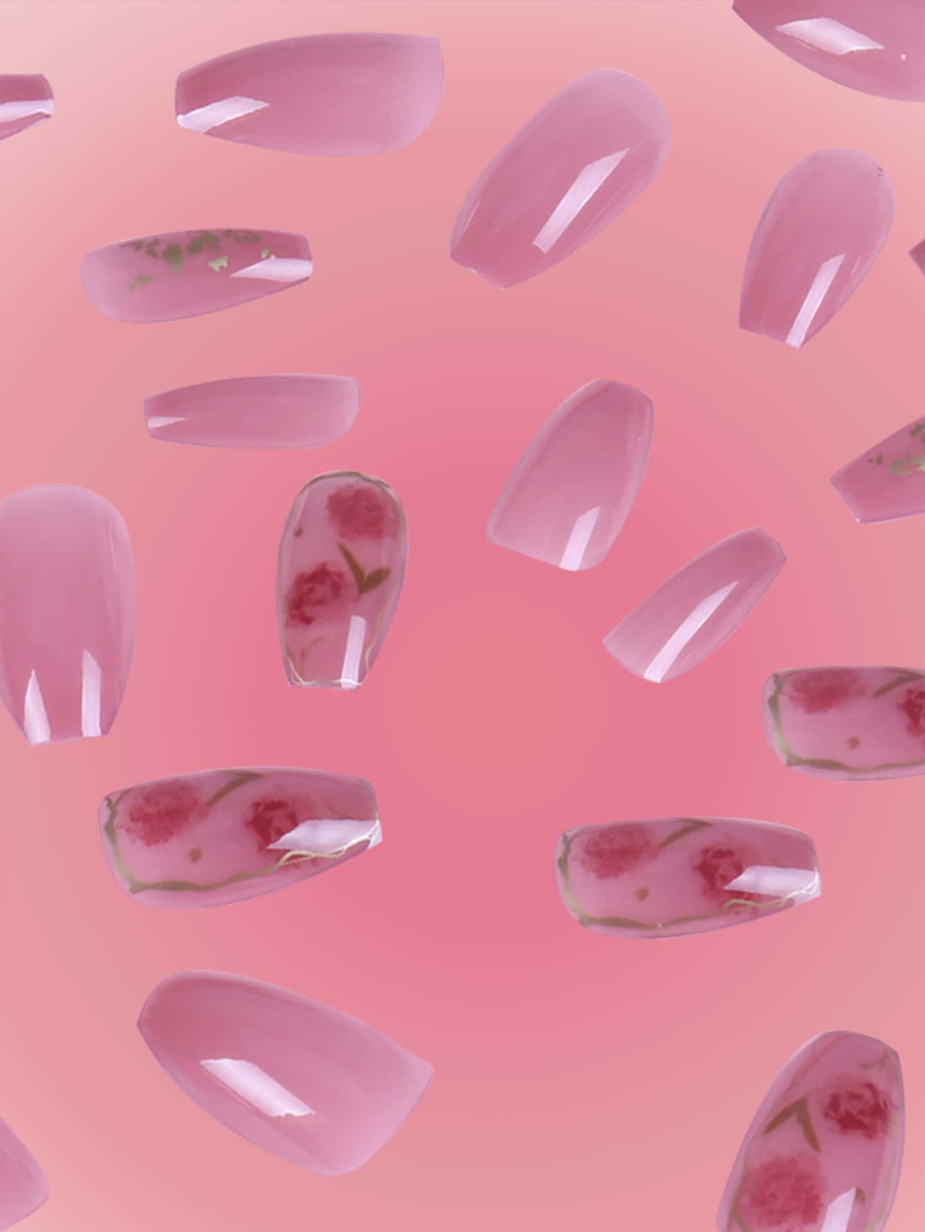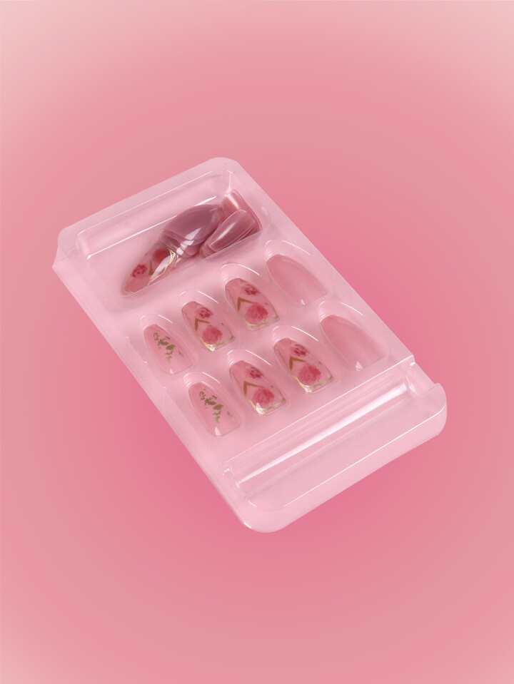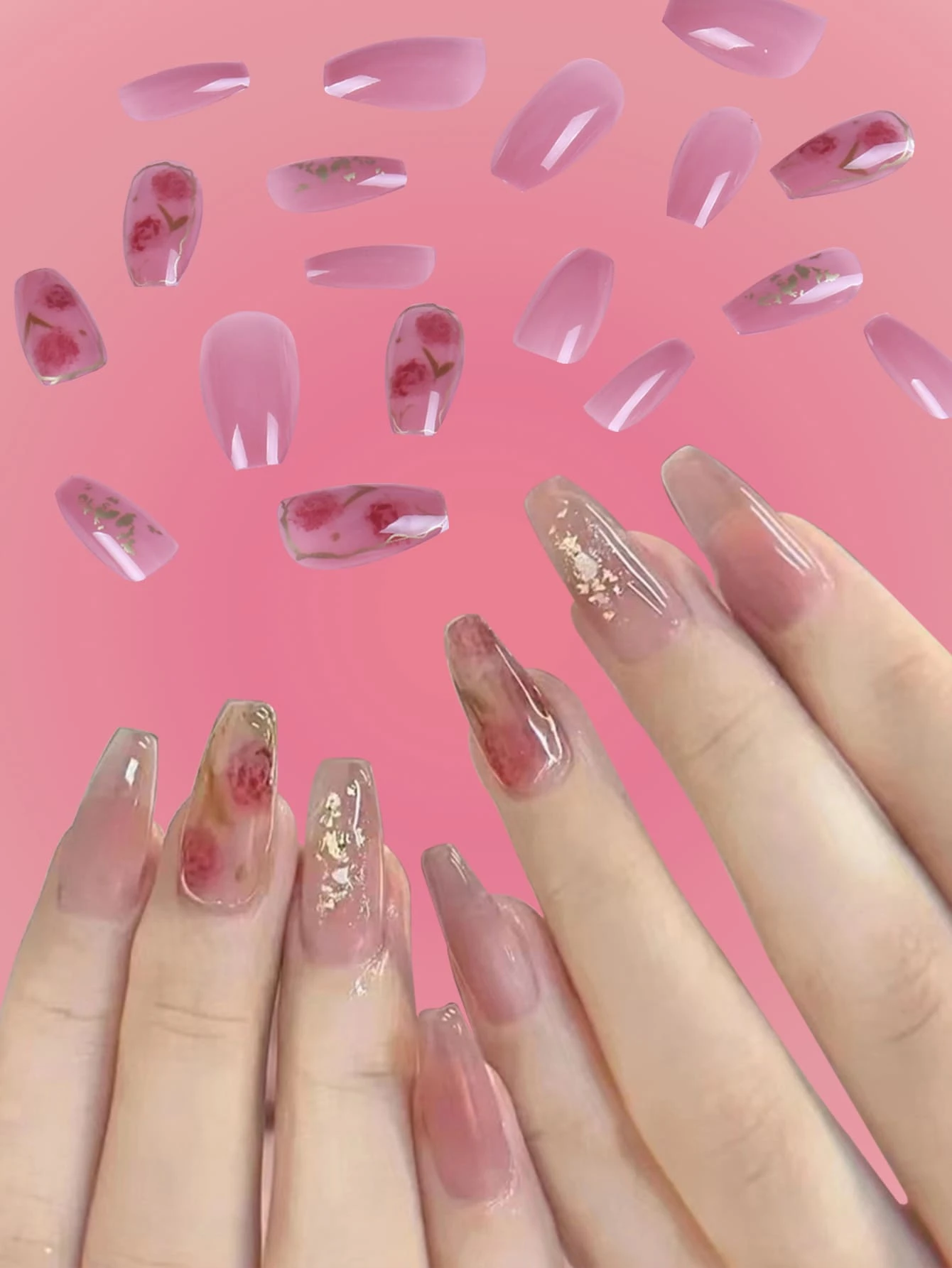 24pcs Long Coffin Rose Pattern Fake Nail & 1sheet Tape