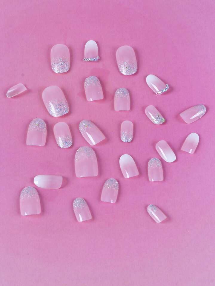 24pcs Long Oval 3D Rhinestone Decor Fake Nail & 1sheet Tape