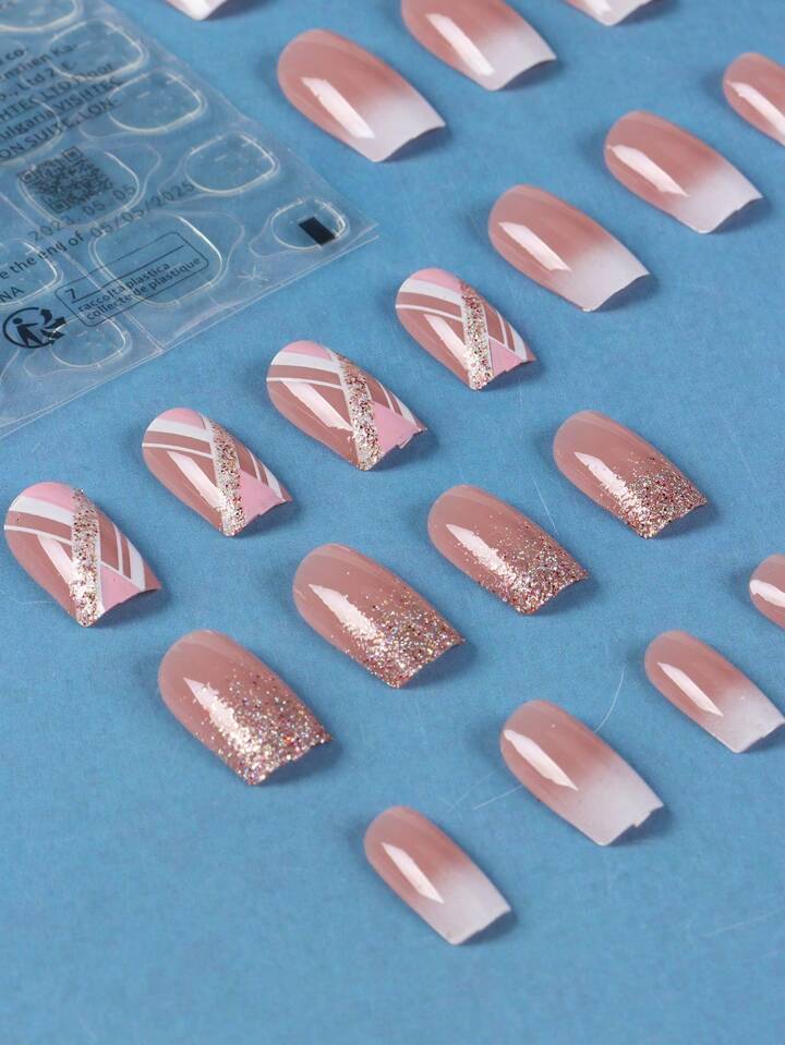 24pcs Long Square Glitter Fake Nail & 1sheet Tape