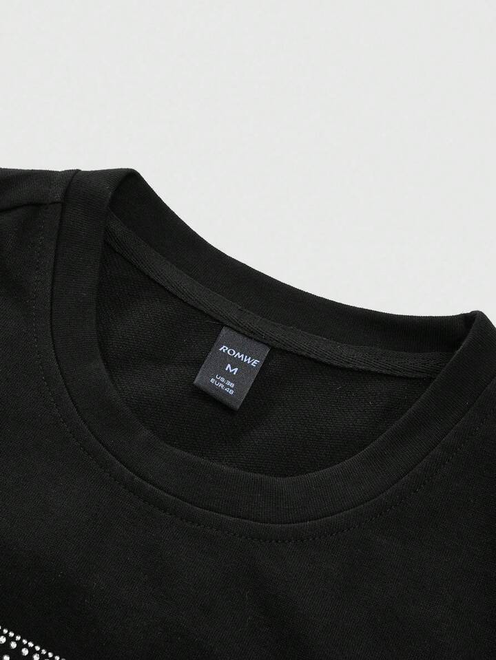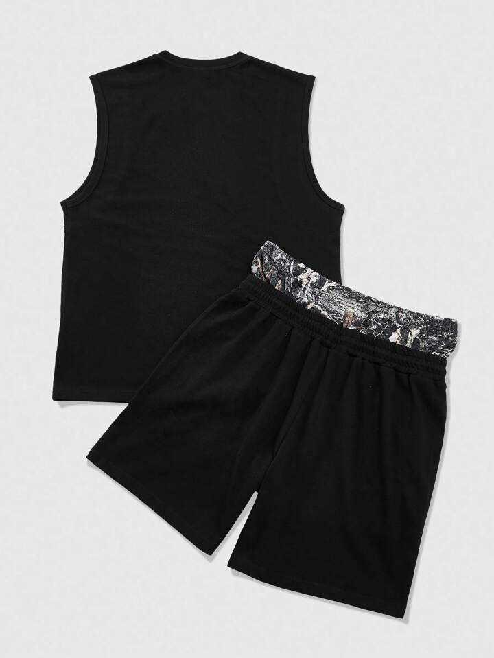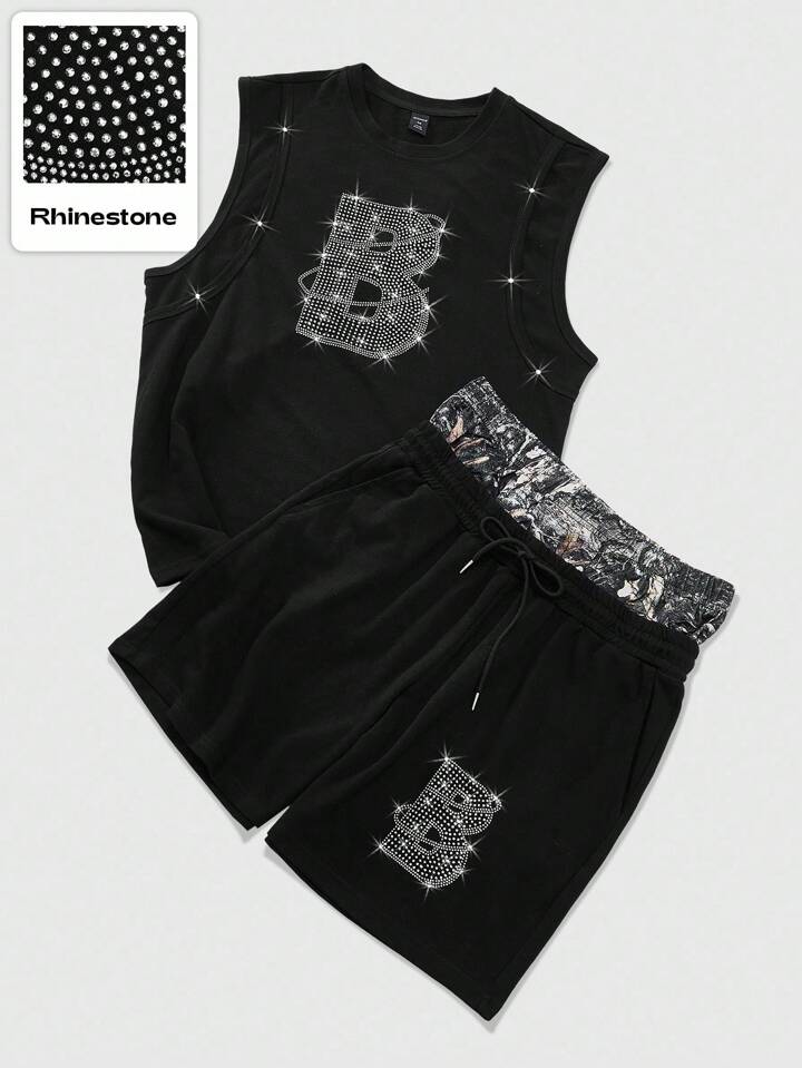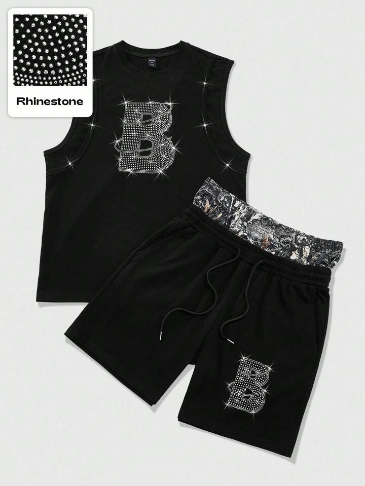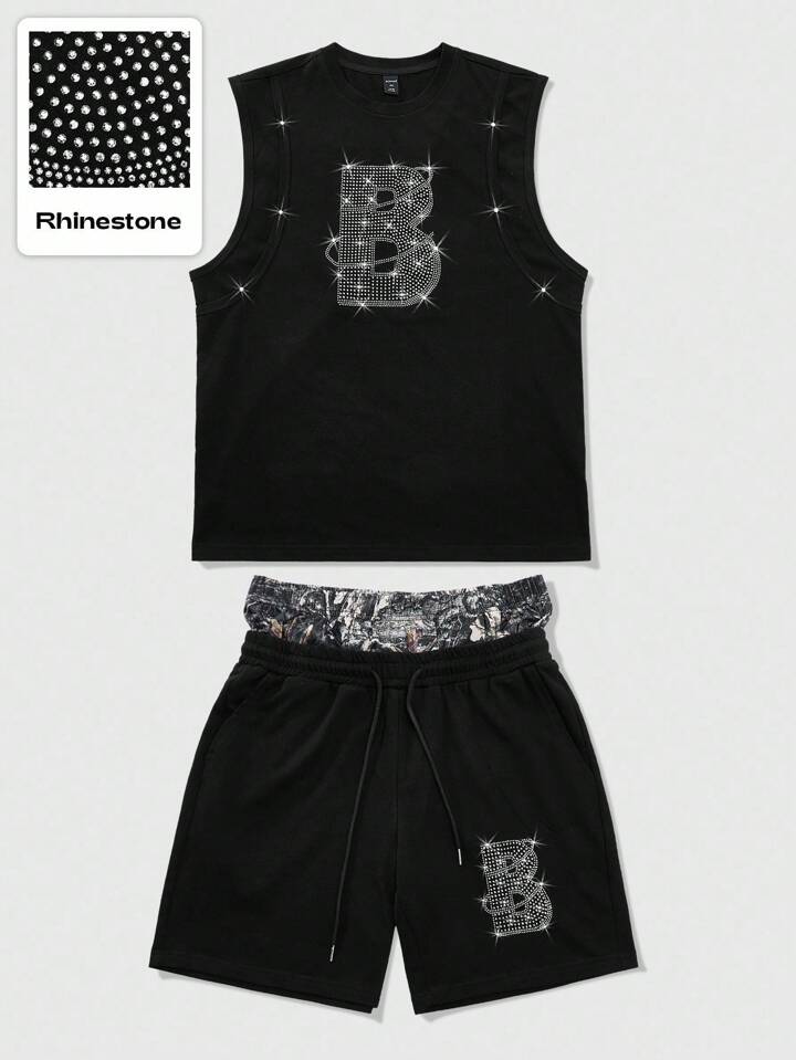 2pcs/Set Men's Street Life Slogan Rhinestone T-Shirt And Shorts Set,