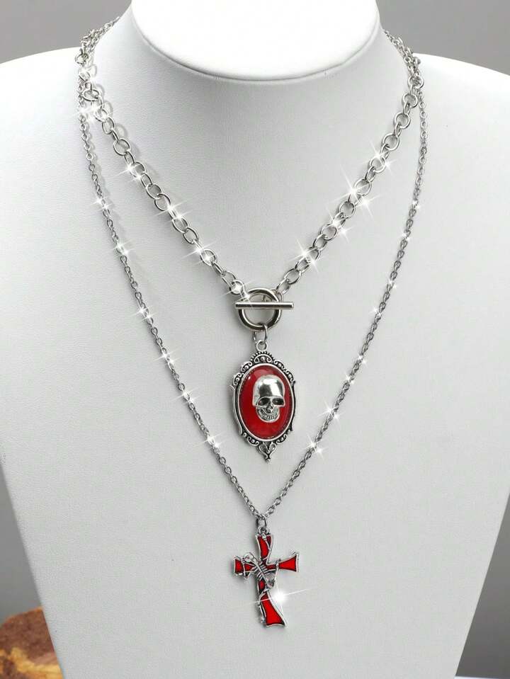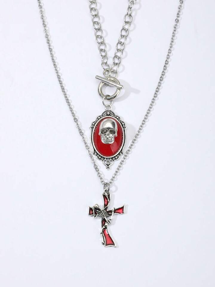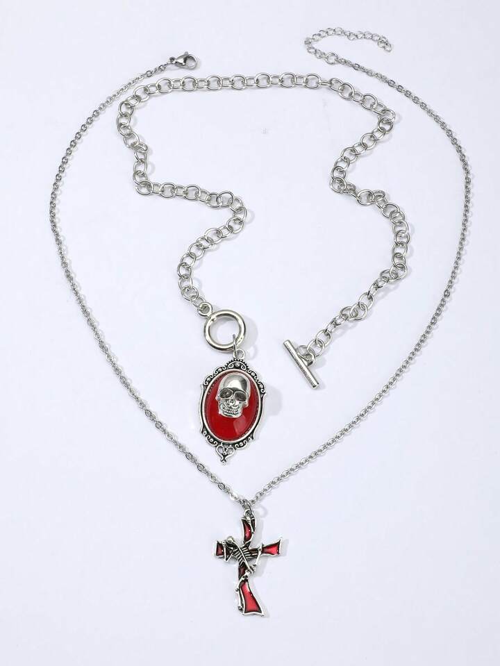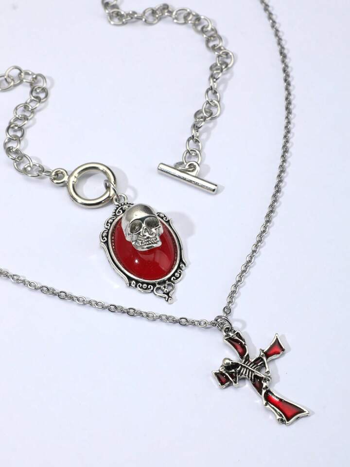 2pcs Vintage Gothic Halloween Cross Tombstone Skeleton Climbing Cross Skeleton Women's Necklace Set