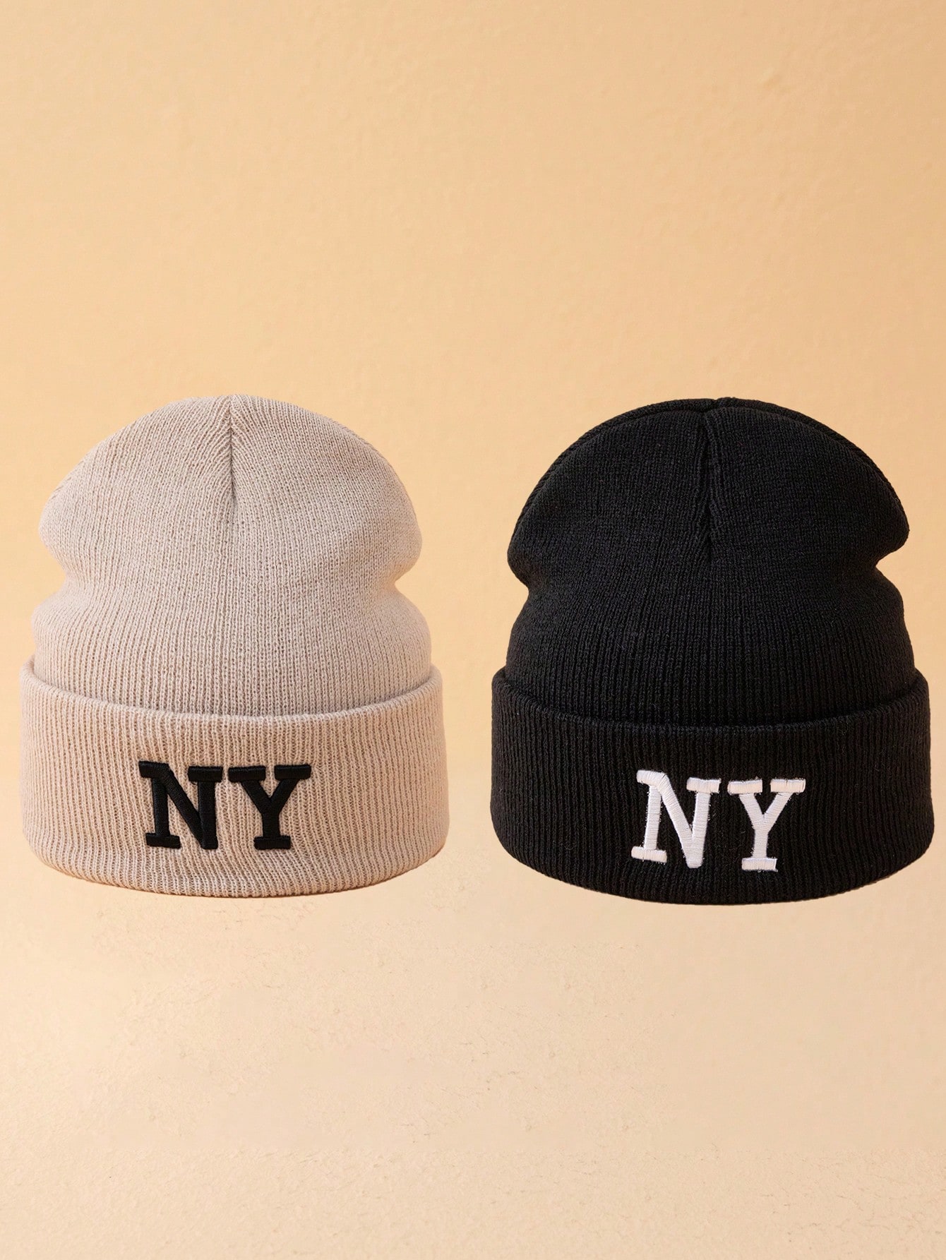 2pcs/set Women's Knitted Beanie Hat With 3d Embroidered Ny And No Brim Beanie, Suitable For Autumn & Winter Outfits