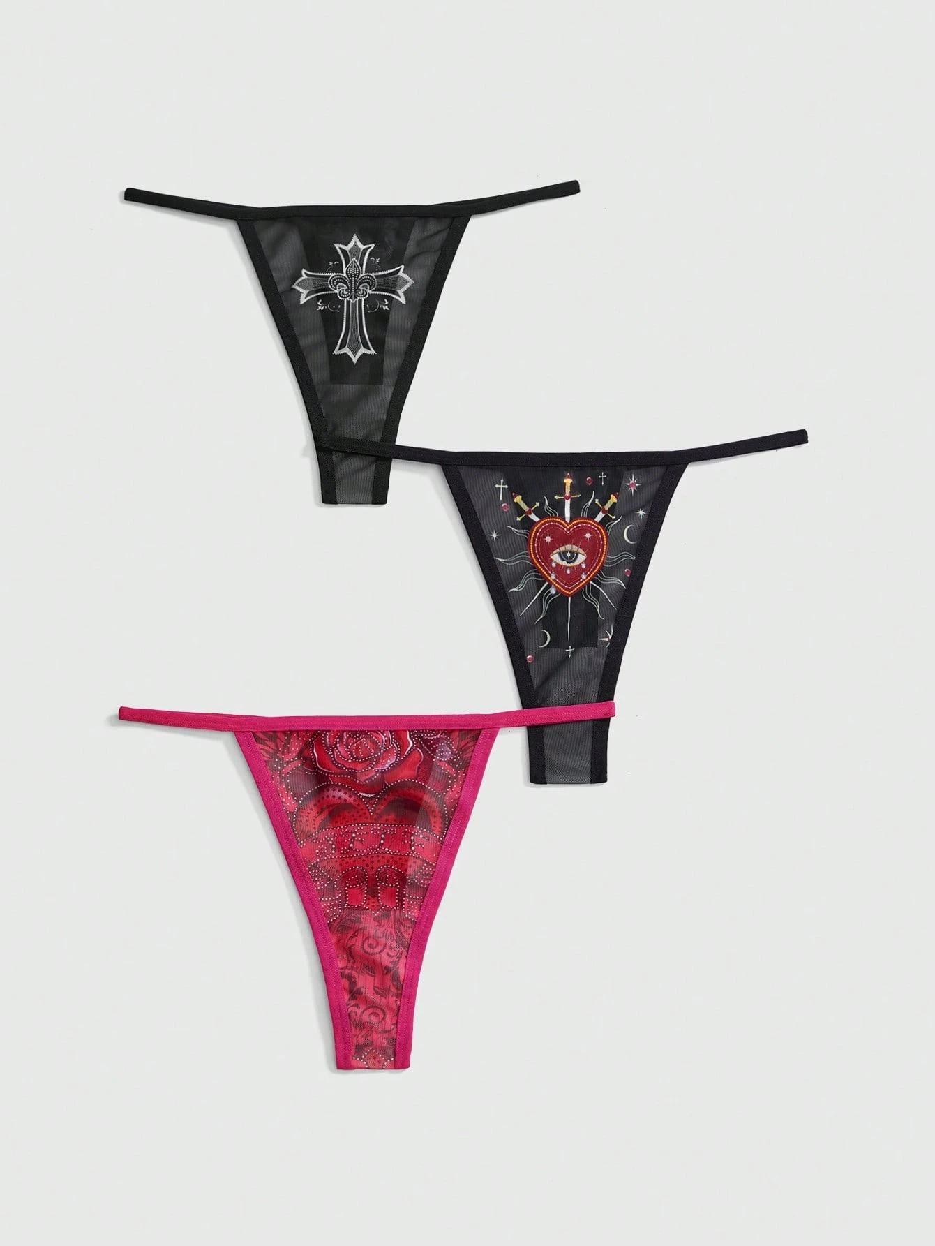 3-Piece Set Gothic Style Embroidered Heart, Crystal Teardrop, Star, Rose, Cross Print Panties For Women