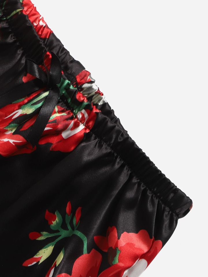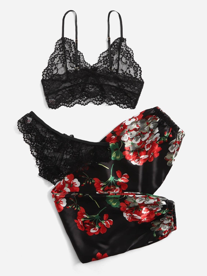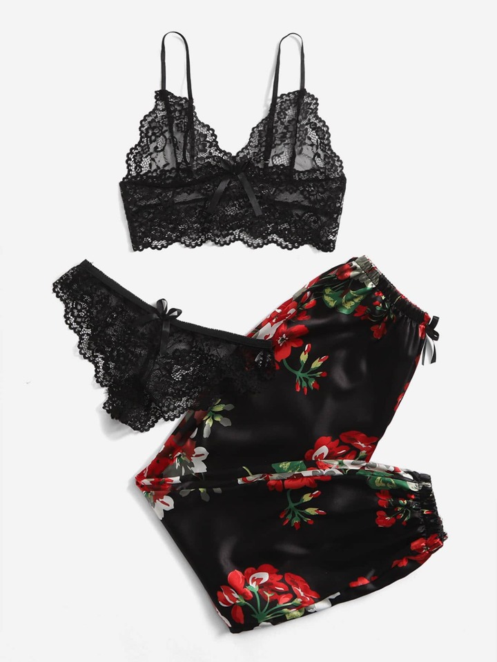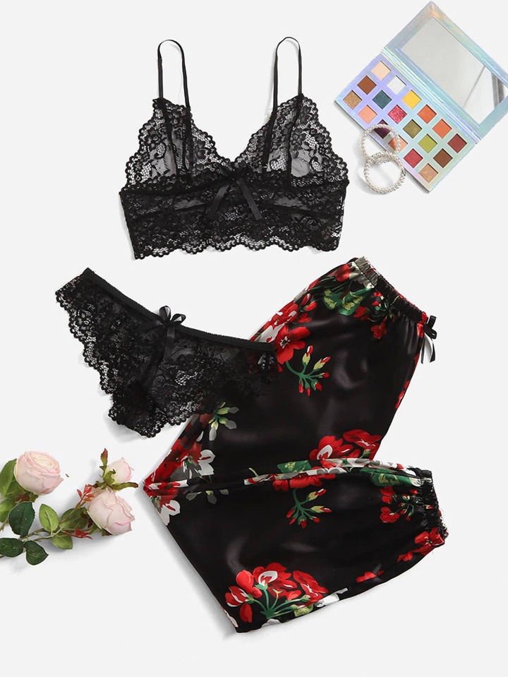 3pack Floral Lace Lingerie Set With Floral Print Satin Pants