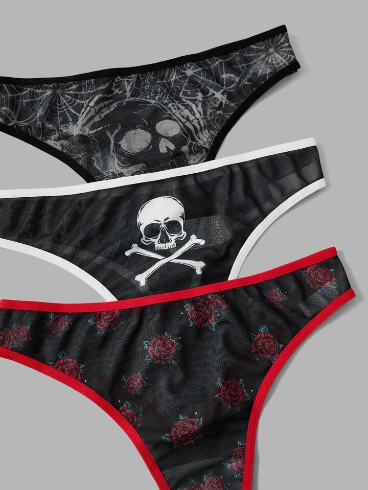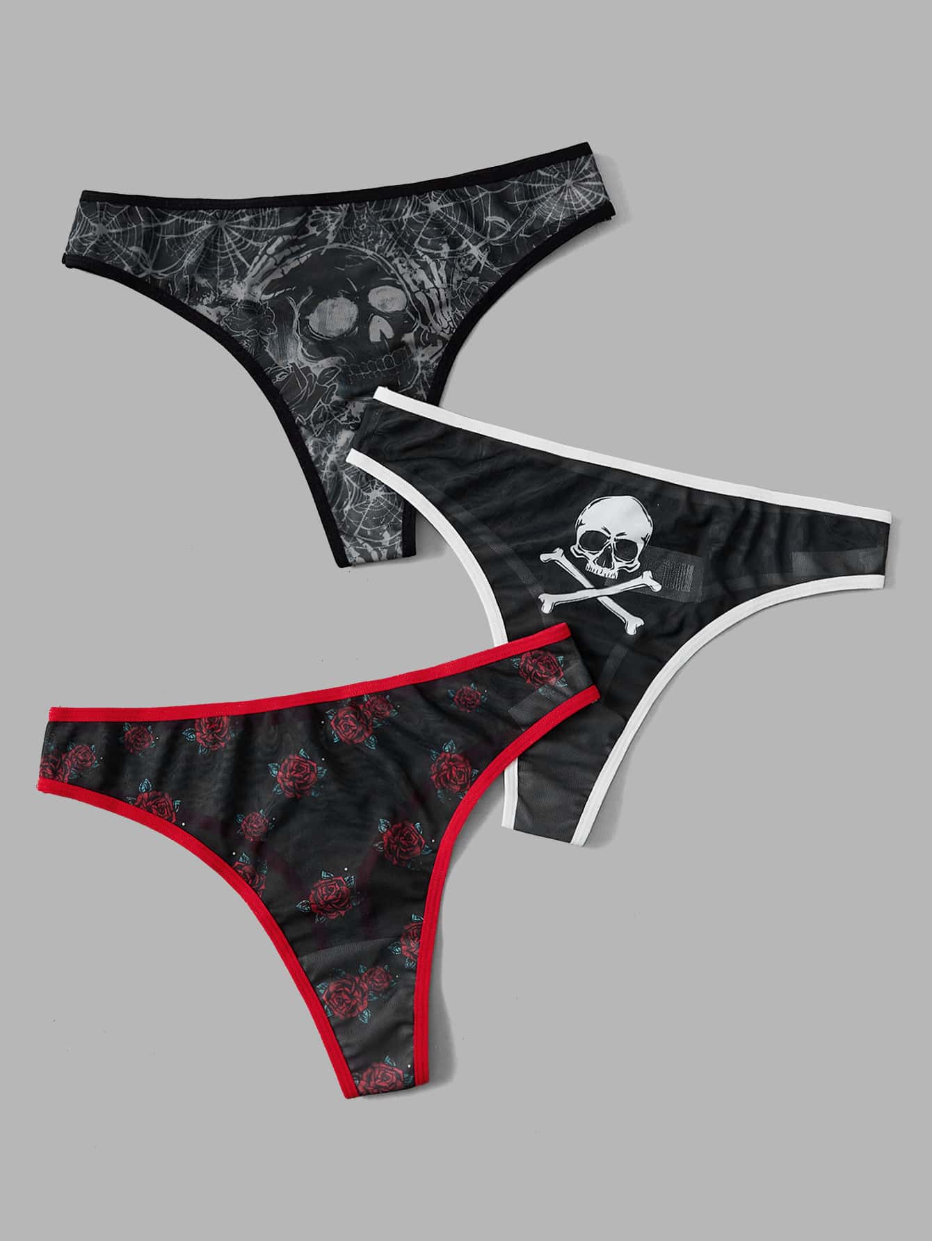 3pack Skull & Floral Print Contrast Binding Panty Set
