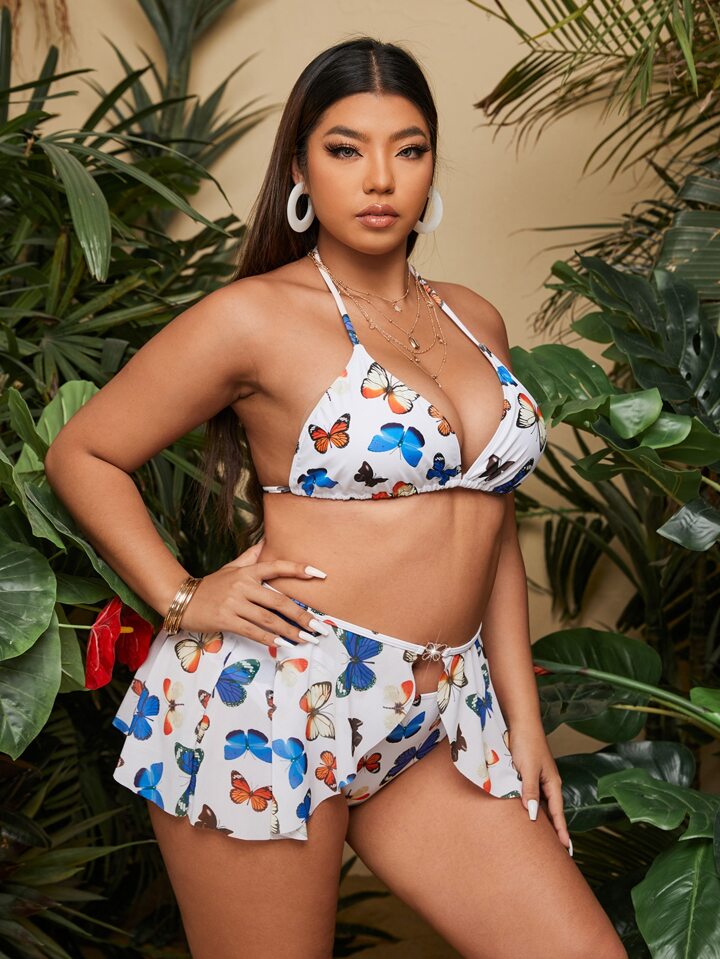 3packs Plus Size Butterfly Print Halter Bikini Set & Beach Skirt Summer Beach