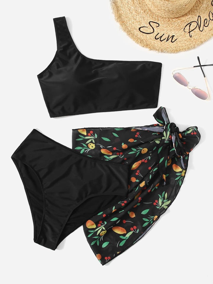 3packs Plus Size Solid One Shoulder Bikini Set & Plant Print Beach Skirt Summer Beach
