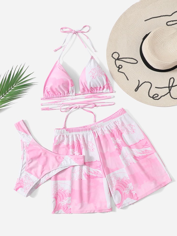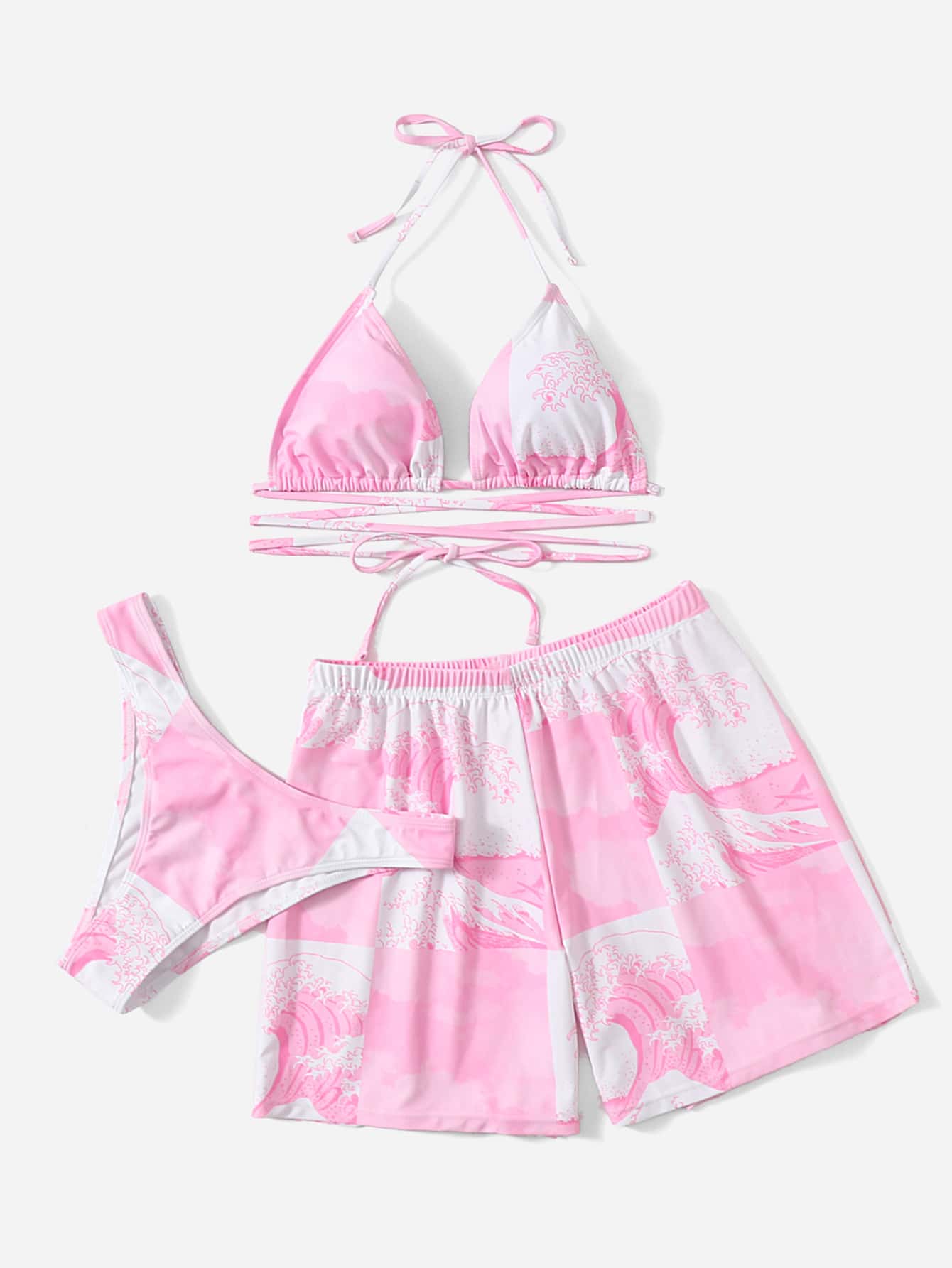 3packs Wave Graphic Criss Cross Halter Summer Beach Bikini Set & Shorts