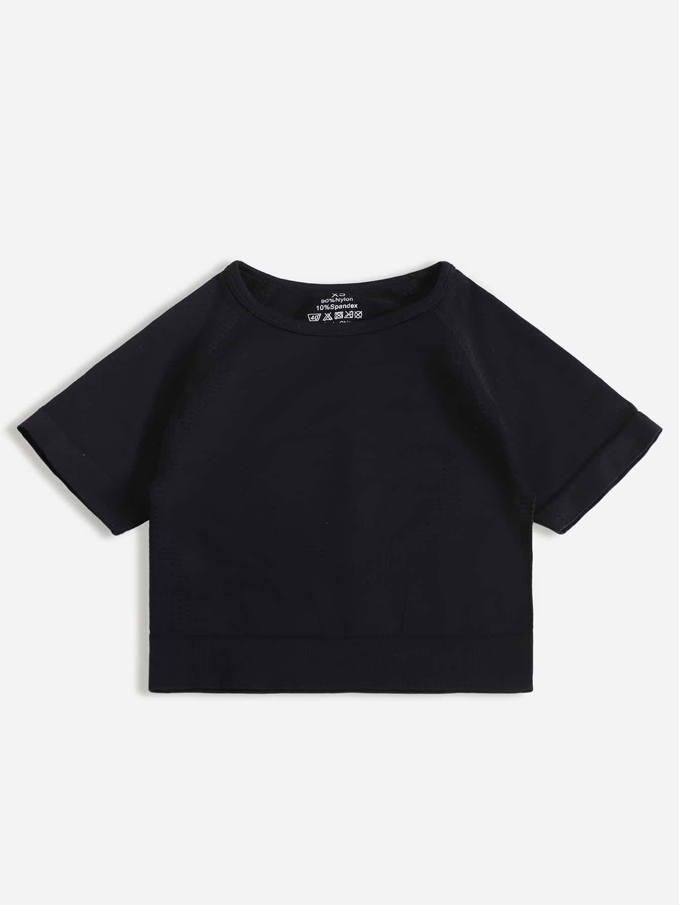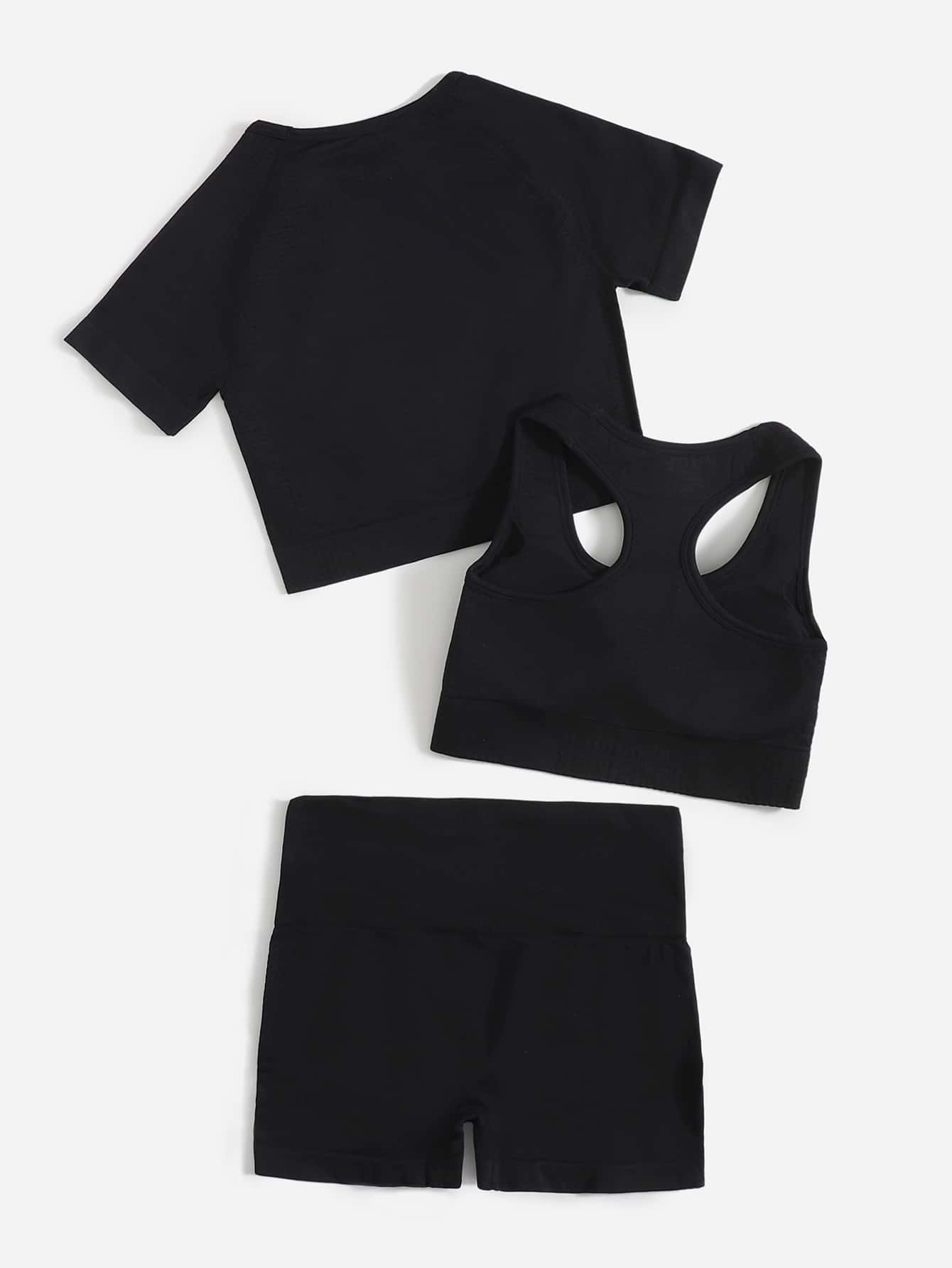 3pcs Seamless Yoga Set Sports Suit Racer Back Sports Bra Round Neck Crop Tee Wide Waistband Shorts