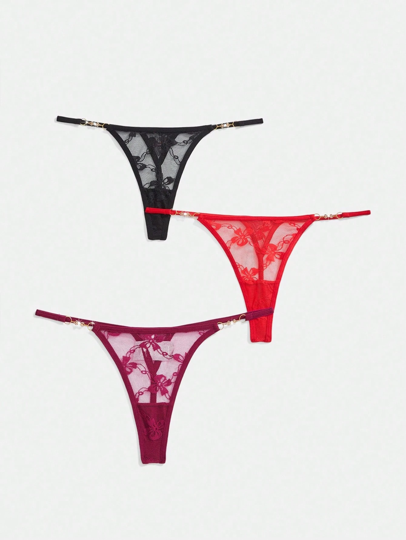 3pcs/Set Lace Butterfly Metal Buckle Thong Panties Set