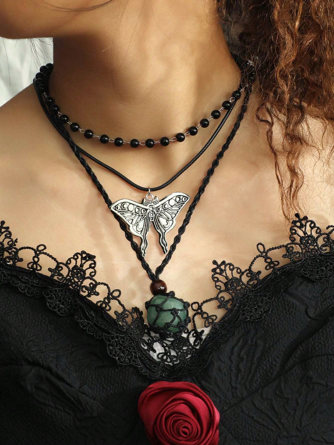 3pcs Vintage Gothic Style Handmade Butterfly & Moon Shape Stone Adjustable Necklace Set With Black Faux Pearls For Women, Boho Jewelry