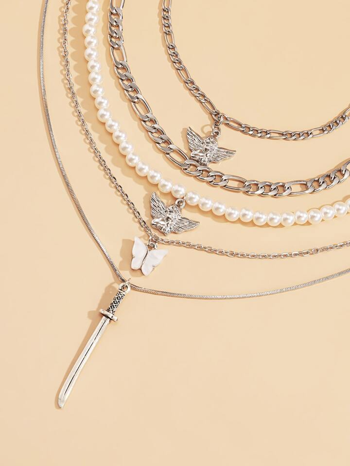 5pcs Angel & Faux Pearl Layered Necklace