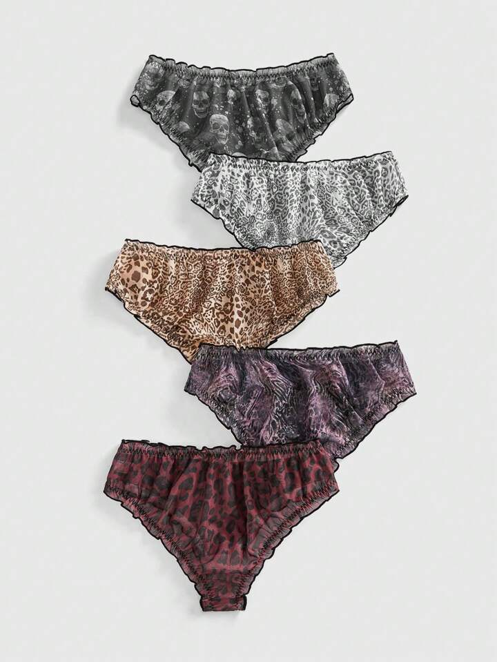 5pcs/Pack Gothic Punk Y2K Skull Leopard Print Mesh Thong Panty Set