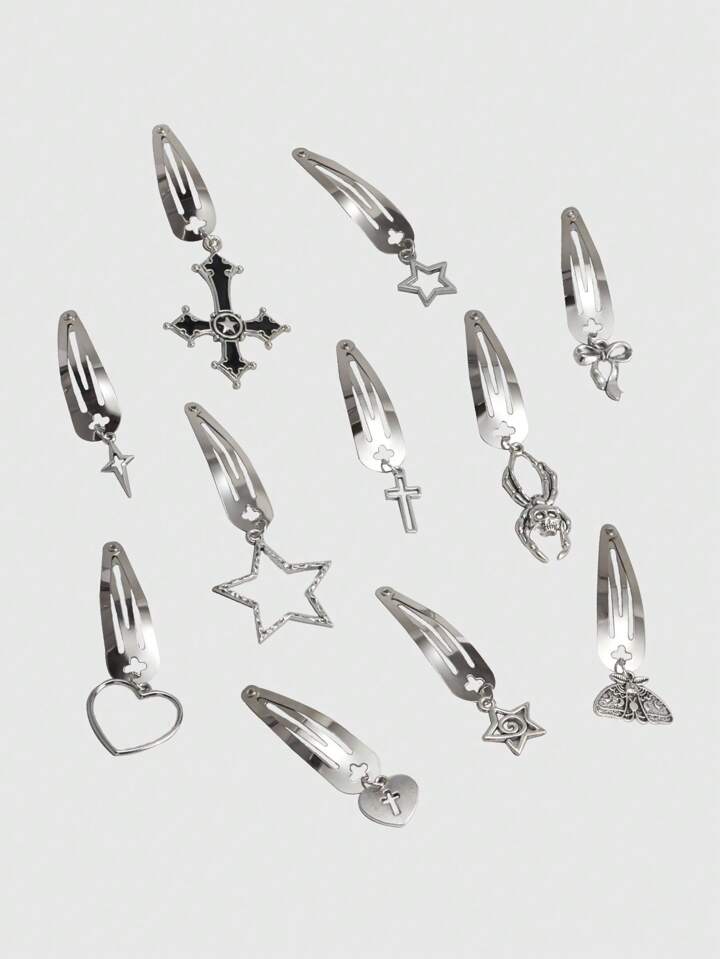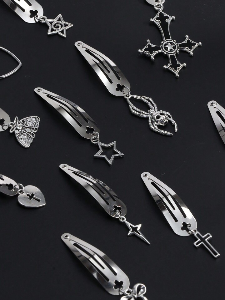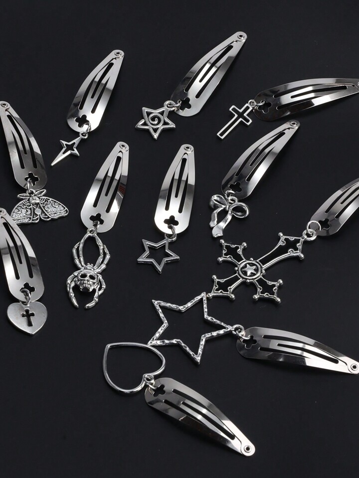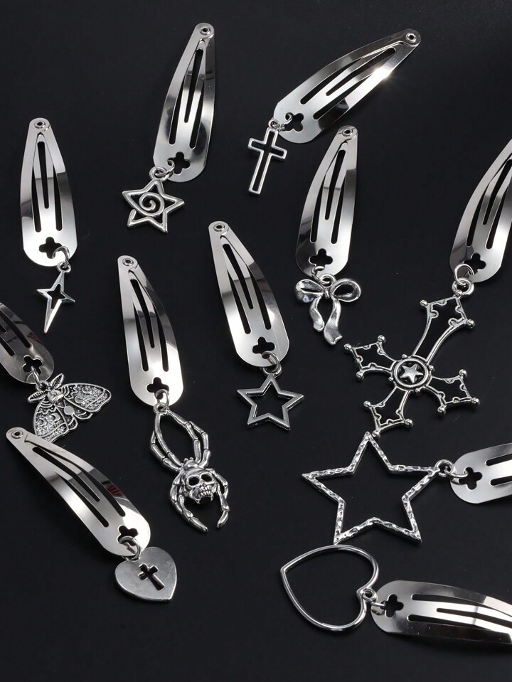 6pcs Gothic Style Star, Heart, Cross Silver Hair Clips, Daily Wear, Back To School, Party Use (Random Style)
