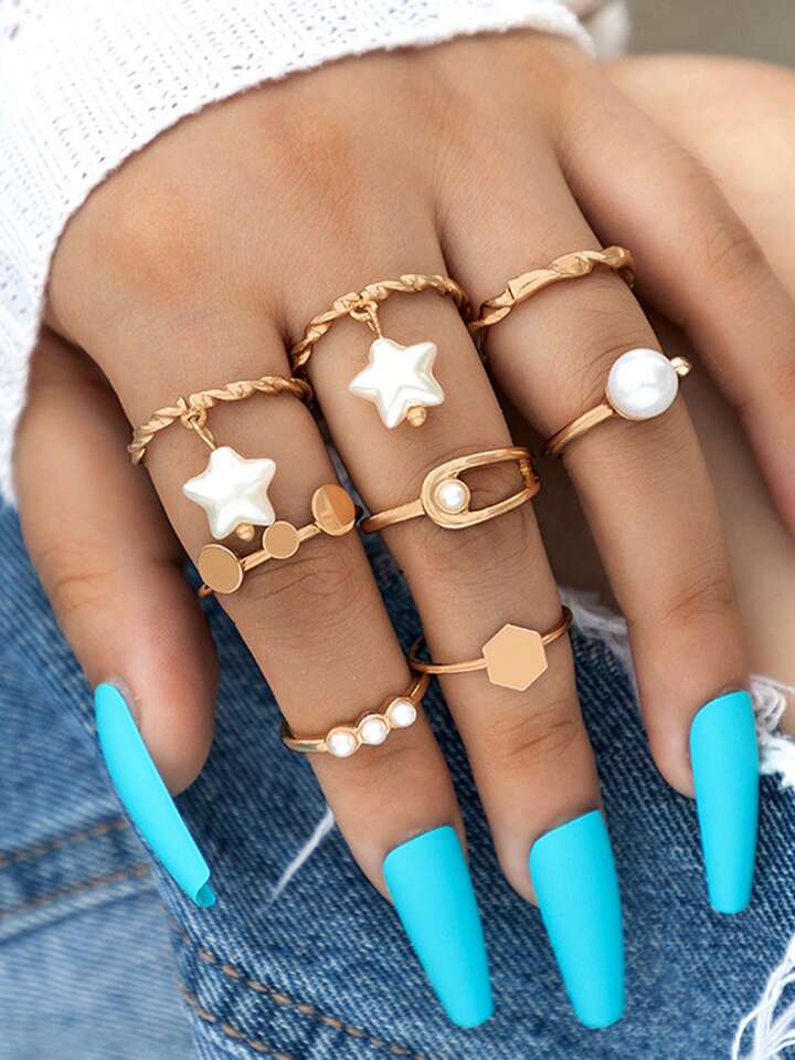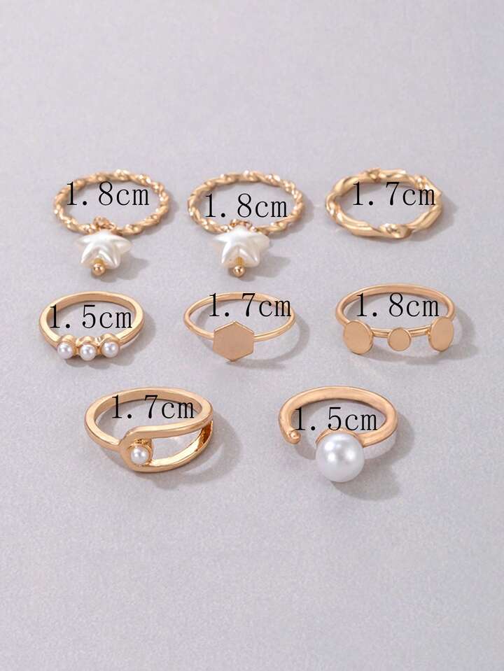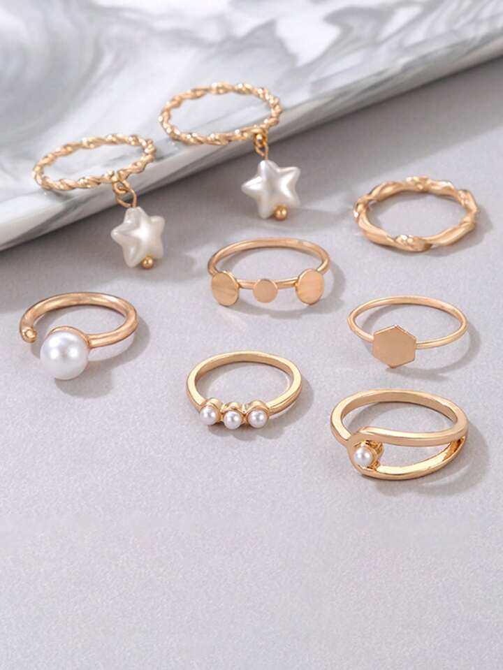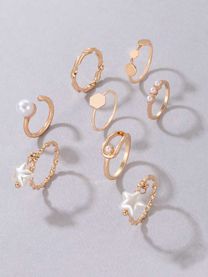 8pcs Fashion Zinc Alloy Star & Faux Pearl Decor Ring For Women For Dating Gift