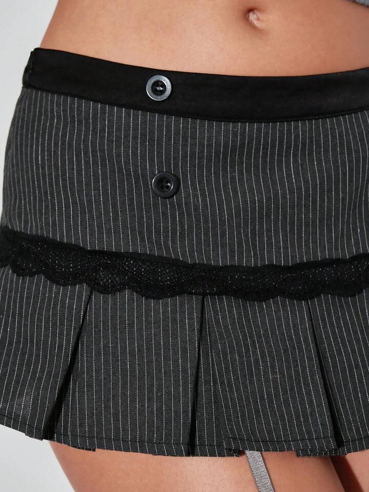 Academia Bad Girl Academy Grey Satin & Lace Waist Patched Mini Pleated Skirt With Shorts Undershorts