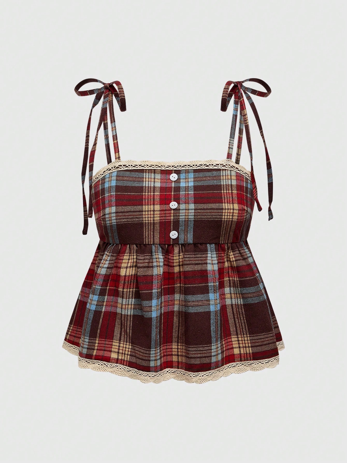 Academia Casual Vintage Button-Down Plaid Front Crisscross Lace Trim Women Tank Top