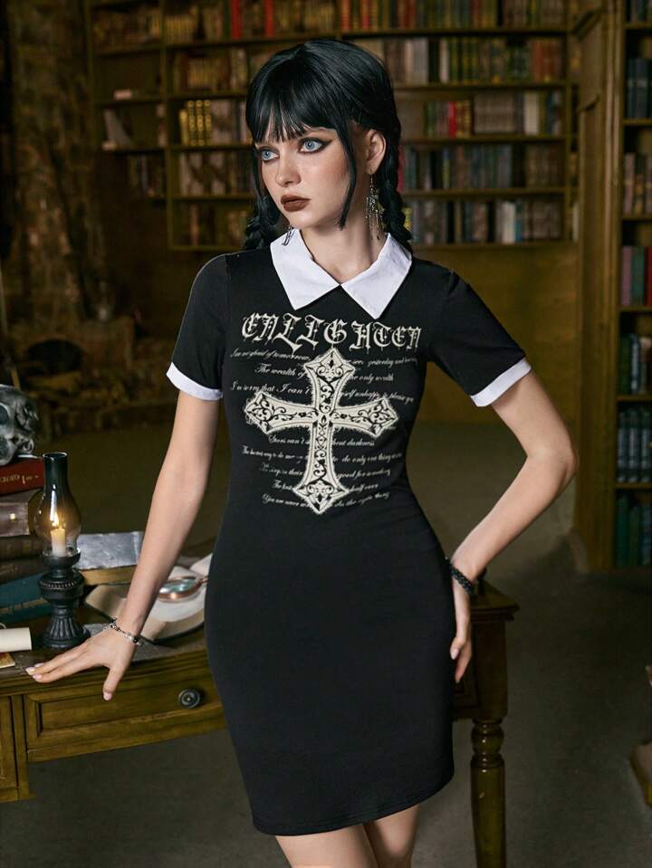 Academia Letter Graphic Contrast Collar Bodycon Dress